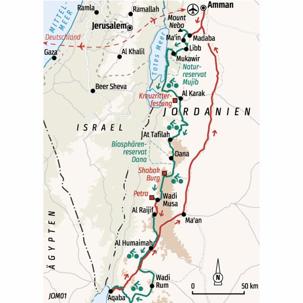 Nach dem Frühstück haben wir Zeit unsere Bikes zusammenzubauen, bevor wir zur ersten Etappe unserer einzigartigen Radreise aufbrechen. Für diejenigen, die mit Ihren eigenen Bikes anreisen, wird es die Möglichkeit geben, die Transporttaschen und -boxen in einem hoteleigenen Lagerraum zu verstauen. Von unserem Hotel aus folgen wir ruhigen Seitenstraßen Richtung Westen, welche uns zum heiligen Berg Nebo führen. Angeblich jener Ort an dem Moses das "gelobte Land" sah. Dort bietet sich ein fantastischer Blick über das Tote Meer und den Jordan bis hin zum Westufer. An einem klaren Tag ist es sogar möglich, die gut 45 km entfernt gelegene heilige Stadt Jerusalem zu sehen. Vom Berg Nebo folgen wir südwärts einer kleinen Straße bis wir das Dorf Main erreichen. Von dort fahren wir auf der Königsstraße (eine alte Route die Madaba mit Petra verbindet) weiter. Nach nur wenigen Kilometern wechseln wir auf einen Karrenweg, dem wir bis nach Libb folgen. Die Fahrt dieses Tages endet im nahe gelegenen Dorf Mukawir. Dort übernachten wir in einer einfachen Unterkunft mit landestypischem Essen. Die Ausstattung der Unterkunft besteht aus einer Warmwasserdusche und vier Schlafräumen, welche von der Gruppe geteilt werden. Mit unserem Begleitfahrzeug besuchen wir die Ruinen des Schlosses von König Herodes, welcher Johannes den Täufer sehr lange gefangen hielt und schließlich enthaupten ließ. Anschließend fahren wir zu einem Aussichtspunkt für den Sonnenuntergang und genießen den eindrucksvollen Rundblick über das Tote Meer.