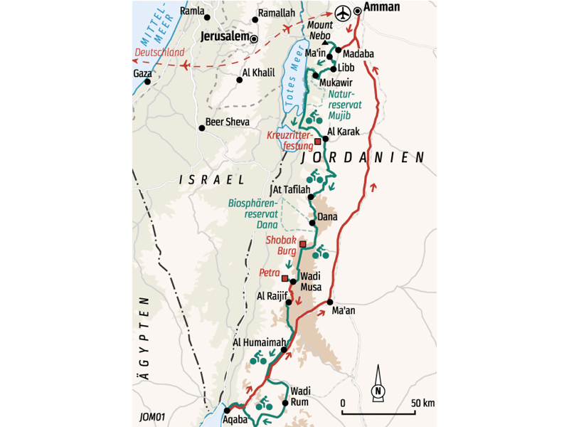 Wüstenlandschaften und kulturelle Glanzlichter Jordaniens auf dem Bike erleben: Vom heiligen Berg Nebo aus geht es zum Toten Meer, 400 m unter dem Meeresspiegel und gleichzeitig tiefster Punkt der Erde. Auf Pisten radeln wir durch den längsten Canyon des Landes zum Dana-Plateau. Den nächsten Höhepunkt bildet die 2000 Jahre alte Felsenstadt Petra mit ihren gewaltigen rot leuchtenden Tempelanlagen, eines der größten von Mensch und Natur gleichermaßen geschaffenen Wunder. Durch großartige Wüstenlandschaften geht es weiter zum Wadi Rum, einem zeitlosen Ort, von dem schon Lawrence von Arabien sagte: "Das Abendrot hüllt die gewaltigen Felsen und Schluchten in ein purpurnes Feuer". Eine Nacht im Beduinen-Camp unter dem endlosen Sternenhimmel bleibt unvergessen. Zum Abschluss der Tour lockt ein Bad im Roten Meer bei Akaba und ein kühler Drink am Strand bevor es zurück in die Zivilisation geht. Eine Biketour, die alle Höhepunkte der jahrtausendealten Kultur und überwältigenden Naturlandschaften Jordaniens vereint.