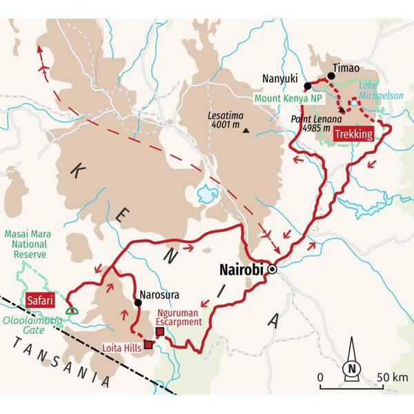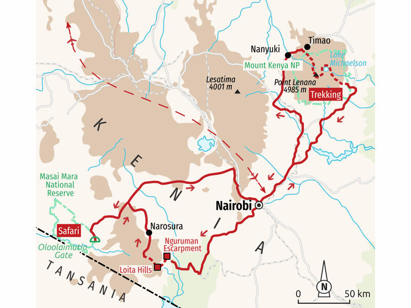Der Fokus dieser Reise liegt auf einer Überschreitung des Mount Kenya via Timau-Route von Norden mit Besteigung des Wandergipfels Point Lenana und Umrundung des Gipfelaufbaus, der Abstieg erfolgt am Lake Michaelson vorbei auf der Chogoria-Route. Außerdem überwinden wir mit Massai am Nguruman Escarpment den ostafrikanischen Grabenbruch und begeben uns auf eine tierreiche Safari in der Masai Mara.