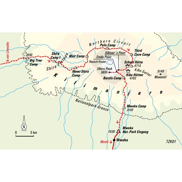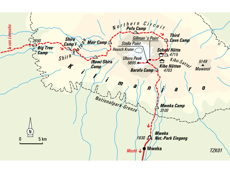Wir erklimmen den Kilimanjaro über die einsamste aller Routen. Auf dem Northern Circuit, der sich nordseitig um den Kibo windet, sind wir mit unserer Begleitmannschaft vielleicht ganz alleine unterwegs. Die nördlichen Eisfelder am Kraterrand thronen hoch über dem Weg. Wir lernen den unberührten Westen, sowie die stille Nordseite und den grünen Süden des Kilimanjaro kennen. Auf dieser Route haben wir 8 Tage, den Kilimanjaro intensiv zu erleben und uns an die Höhe zu gewöhnen, so viel Zeit nehmen sich die Wenigsten. Das Auf und Ab bietet die bestmögliche Akklimatisierung, ist aber konditionell fordernd. Ein einsames und einzigartiges Bergabenteuer erwartet uns!