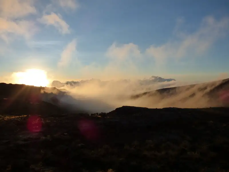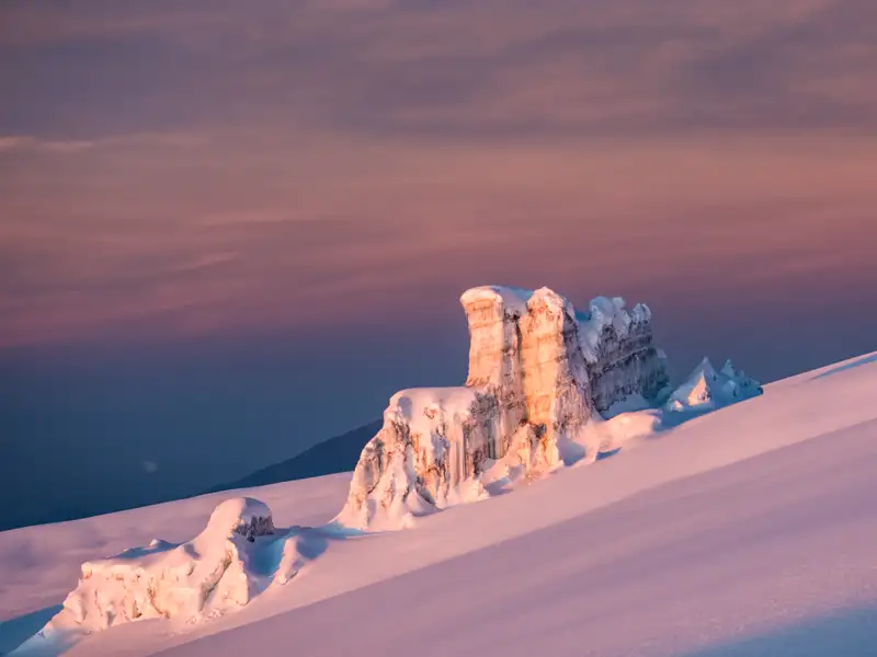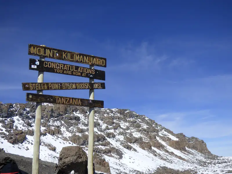 Nach einer kurzen Ruhephase und einem heißen Getränk beginnen wir zwischen Mitternacht und 01:00 Uhr unseren finalen Aufstieg zum höchsten Punkt Afrikas. Der Pfad verläuft erst relativ flach ein Stück gen Süden, bis wir die Hans-Meyer Höhle erreichen. Von hier führt ein endlos scheinender Schotterhang hinauf zum Gilman's Point (5.685 m), wo wir nach einer langen Nacht einen fantastischen Sonnenaufgang über dem Mawenzi-Gipfel erleben können, wenn das Wetter mitspielt. Wer noch Kraftreserven hat, sollte nach einer kurzen Pause, die letzten, weniger steil verlaufenden zwei Stunden entlang des Kraterrands in Angriff nehmen, die zum höchsten Punkt des Kilimanjaro, dem Uhuru Peak (5.895 m), führen. Über den Wolken muss die Freiheit wohl grenzenlos sein! - Ein Moment, den man nie mehr vergisst! Nach einer kurzen Rast mit einem Schluck warmem Tee und dem obligatorischen Gipfelfoto steigen wir via Stella Point und Barafu Camp (4.640 m) ab. Hier wartet unsere Begleitmannschaft bereits mit einem warmen Essen auf uns, das uns Kraft für den langen Abstieg spendet. Wir steigen weiter ab zum Millenium Camp auf 3.800 m Höhe, wo wir feststellen, wie gut man nach einem Gipfeltag am Kilimanjaro schläft.