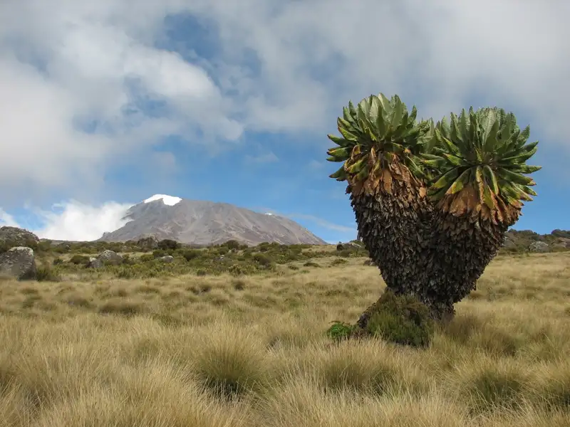Durch den dichten Bergwald gelangen wir bald ins Hochmoor mit Heidekraut. Wir wandern ein Stück weiter und finden uns zwischen Senecien und Lobelien wieder, die Senecien werden hier bis zu 9 Meter hoch! Unser Blick schweift immer wieder in Richtung Mount Meru hinüber. Wir überqueren den Shira Kamm auf ca. 3.500 m und steigen dann hinab zum Shira Camp I, das auf 3.500 m Höhe an einem Flusslauf liegt.