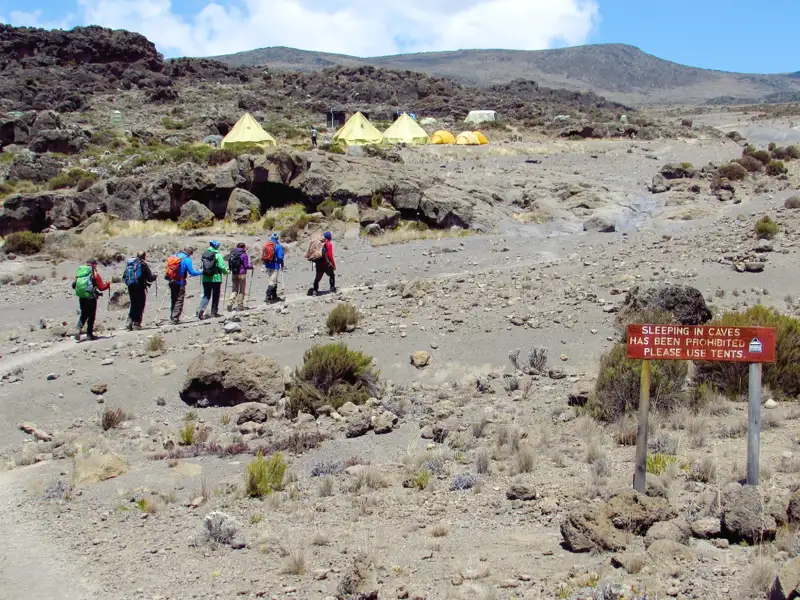 Wir gehen weiter auf dem Northern Circuit. Der Weg führt uns weiter ostwärts durch eine Landschaft mit zunehmend spärlicherer Vegetation. Wir treffen auf die von Norden kommende Rongai Route und steigen wieder ein wenig auf, bis wir am frühen Nachmittag die dritte Kikeleva-Höhle (3.935 m) erreichen.