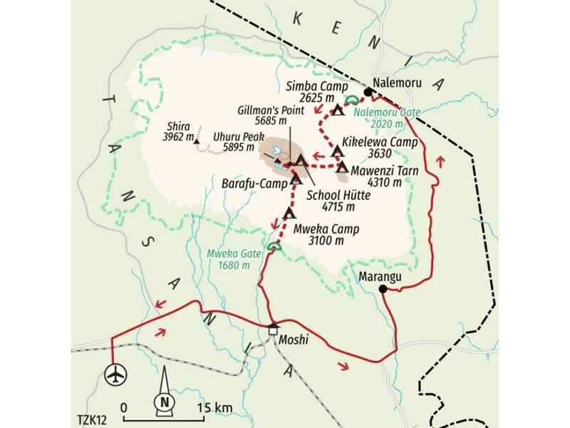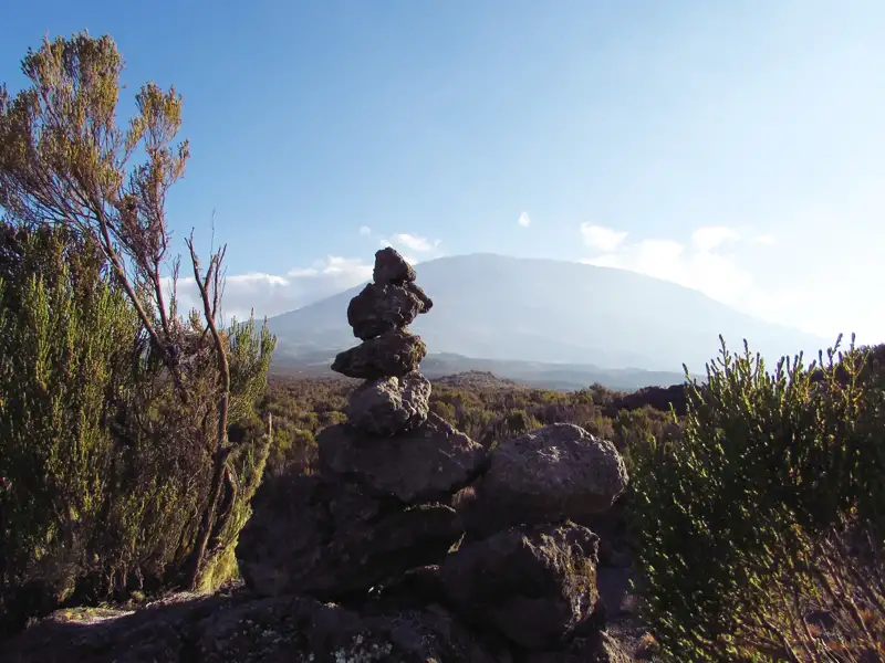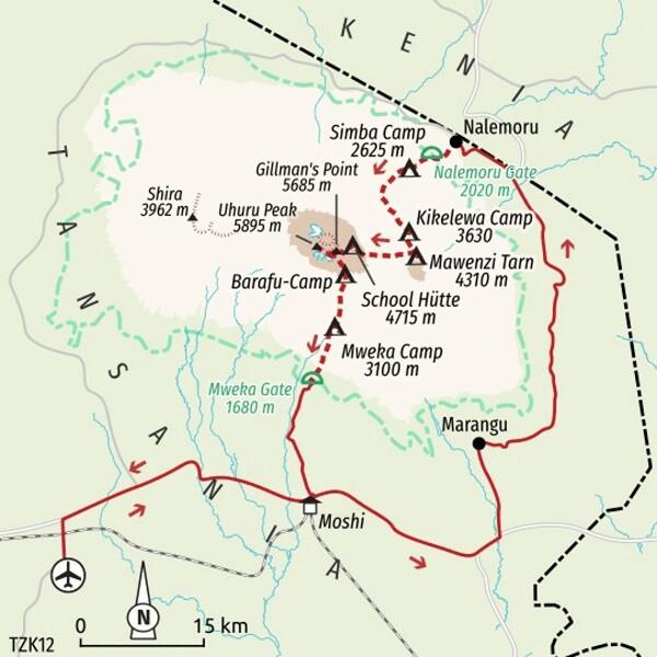 Majestätisch türmt sich das Bergmassiv des Kilimanjaro vor uns auf. Auf keiner anderen Route ist die Aussicht auf das Dach Afrikas so fortwährend unser stetiger Begleiter wie auf der wenig frequentierten und wettersicheren Kikeleva-Route. Von der trockenen Nordseite startend, wenige Kilometer von der kenianischen Grenze entfernt, haben wir die Sonne im Rücken und ideale Bedingungen für die schönsten Panoramablicke auf die Gipfel des Kilimanjaro und Mawenzi. Mantelaffen springen über uns in den Ästen herum und vielleicht sehen wir sogar Elefanten und Büffel zu Beginn unseres Trekkings - auf jeden Fall aber die mächtigen Gipfel sowie in nördlicher Richtung das kenianische Hochland. Wir queren das Hochmoor bis zur zweiten Kikeleva-Höhle, steigen in die karge Wüstenzone am Fuße des Mawenzi auf und campen in einmaliger Kulisse am einzigen See am Kilimanjaro. Auf unserer vergleichsweise einfachen Route passieren wir den Kibo-Sattel und kommen dem Gipfelglück näher – und spätestens wenn wir am Gilman’s Point vor dem berühmten Holzschild stehen, wissen wir dass sich der anstrengende Gipfeltag gelohnt hat. Sicher das Highlight, doch mit der Überschreitung wechseln wir auch die Szenerie: Lavasand und Geröll weichen dem immergrünen Regenwald und der niederschlagsreichere Süden erwartet uns! Wir können uns kaum satt sehen an den Flechten, die von den Bäumen hängen und den bunten Blüten der vielen Pflanzen. So einsam der Norden, so kontrastreich der Süden!