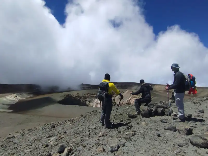 Die zweite Etappe führt durch das Hochmoor hinauf zur zweiten Kikeleva-Höhle (ca. 3.480 m), wo wir etwas Warmes zu Mittag essen. Der heutige Tag ist ein bisschen anstrengender als der gestrige, wir wandern länger und die Etappe verläuft steiler. Wir verlassen den Hauptweg und folgen einem kleineren Pfad in Richtung des zerklüfteten Gipfels des Mawenzis. Am Nachmittag erreichen wir das Kikeleva Camp (3.630 m) in der Nähe eines kleinen Bachs und können die grandiose Aussicht auf die östliche Flanke des Kibo, des höchsten Vulkans des Massivs, genießen. Hinsichtlich der Höhenanpassung ist es auch heute sehr ratsam, noch ein Stück aufzusteigen.