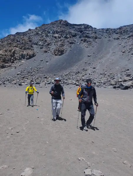 Wir starten zeitig und wandern, nach kurzer Steigung über den Kibo-Sattel, lange durch die karge Landschaft in Richtung Kibo-Hut. Noch bevor wir diese sehen, zweigen wir rechts ab und gelangen über einen steilen Hang zur School Hut (4.715 m), unserem Tagesziel. Wir übernachten bei der Hütte in Zelten. Früh essen wir zu Abend und versuchen so viel Ruhe und Schlaf wie möglich zu bekommen, da wir kurz vor Mitternacht bereits wieder aufstehen, um uns für den Gipfeltag bereit zu machen.