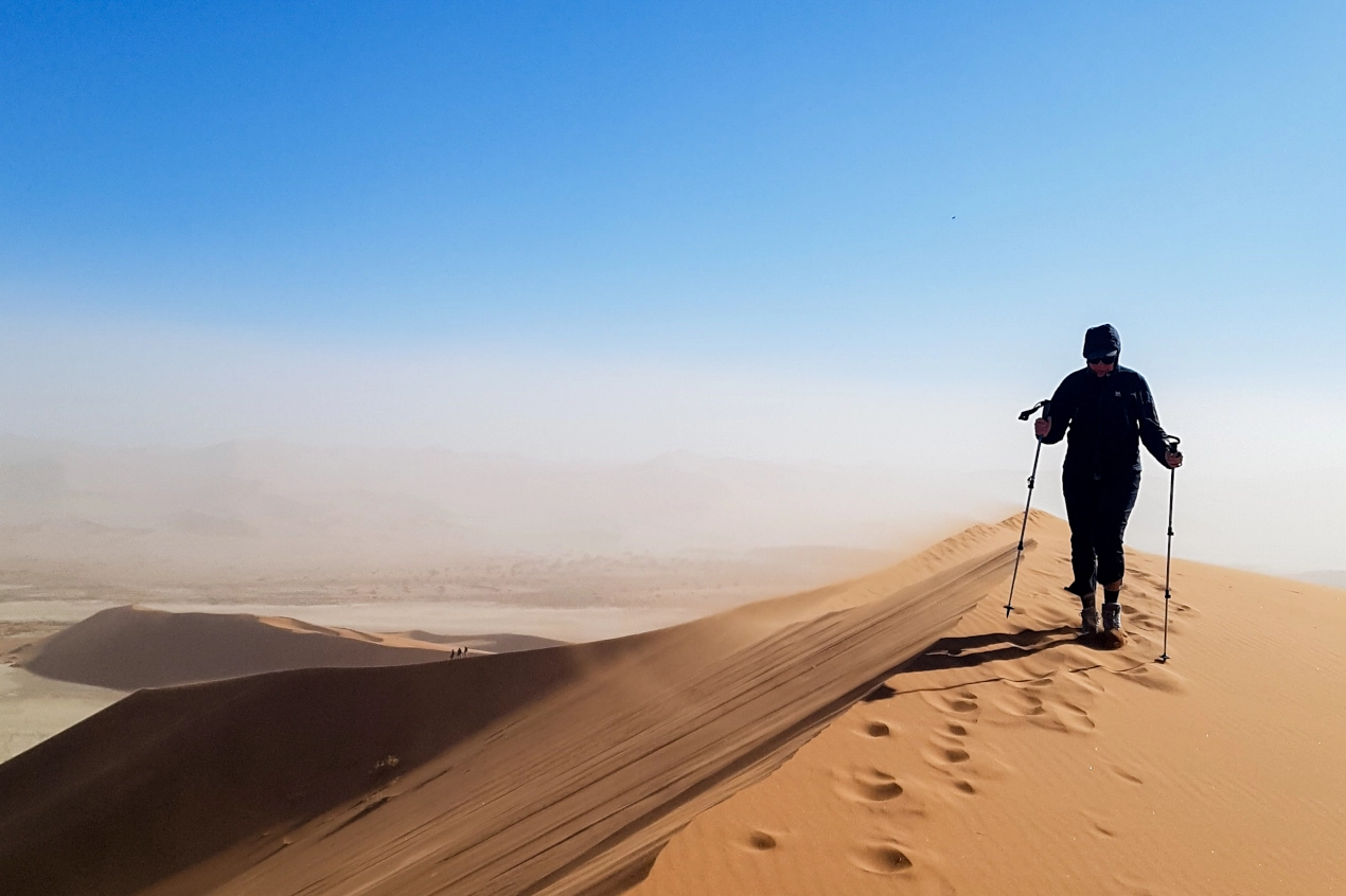 Farbenspiele begrüßen den Frühaufsteher am Morgen in der Namibwüste: Die sternenklare Nacht wechselt in sanftes Pastellblau, zieht sich dann ein leichtes Zartrosa an und weicht bald dem ersten Hellgelb, bis die Sonne über der Wüste die Luft aufheizt und flirren lässt. Schritt für Schritt erklimmen wir die orange-roten Dünen des Sossusvlei, mit Schweißperlen im Nacken, und lassen auf der Düne 45 den Wind all Ihre Sorgen wegblasen.