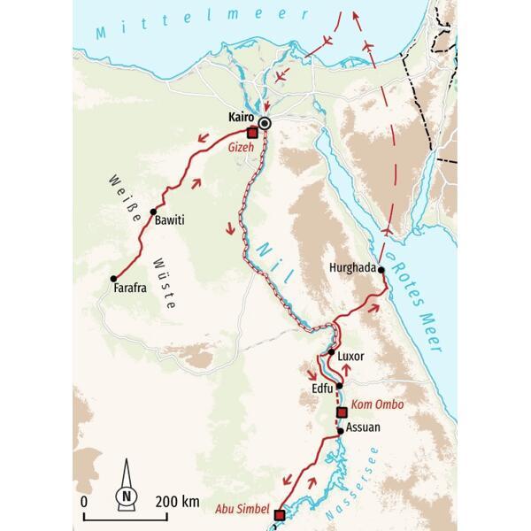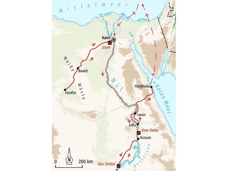 Der Fokus dieser Reise liegt auf der reichen Kultur des Landes. Wir lernen Kairo, Gizeh und Luxor kennen und sind mit dem Segelschiff auf dem Nil unterwegs. In der Schwarzen und Weißen Wüste unternehmen wir einfache Wanderungen, auf denen wir die eindrucksvolle Landschaft bewundern. Am Ende der Reise fahren wir zum Entspannen und Baden ans Rote Meer.