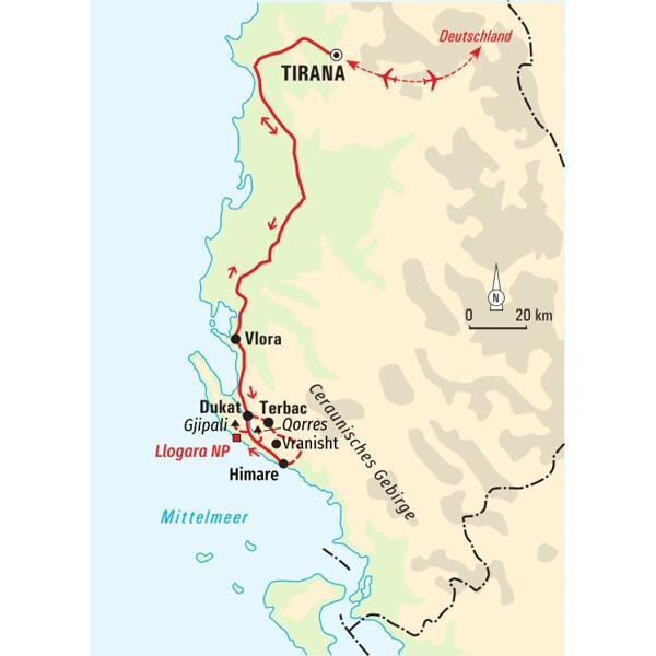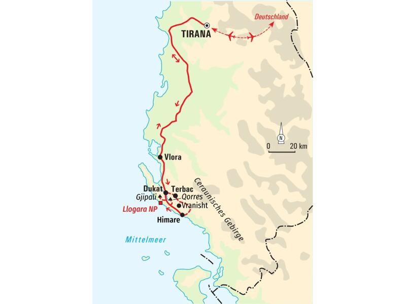 Direkt von unserem Hotel folgen wir einem Weg hinein in den dichten und märchenhaft anmutenden Wald des Llogara Nationalparks, bis sich das Grün lichtet und der Wald sich zu einem Sattel öffnet. Vorbei an einigen Schäferhütten steigen wir nun über den Grat des Küstengebirges bis zum Gipfel des Gjipali (1.446 m) auf. Noch einmal können wir den weiten Blick über die Küste und bei gutem Wetter bis zur nahe gelegenen Insel Korfu genießen. Nach einem kurzen Abstieg beenden wir unsere letzte Wanderung in einem Biergarten, dann geht es mit dem Minibus hinab in die Bucht von Orikum und Vlora. Vielleicht bleibt noch etwas Zeit für einen erfrischenden Sprung ins Mittelmeer, bevor wir unsere Fahrt nach Tirana antreten. Bei einem letzten gemeinsamen Abendessen lassen wir die vergangenen Wandertage noch einmal Revue passen und stoßen auf die facettenreiche Wanderwoche an.
