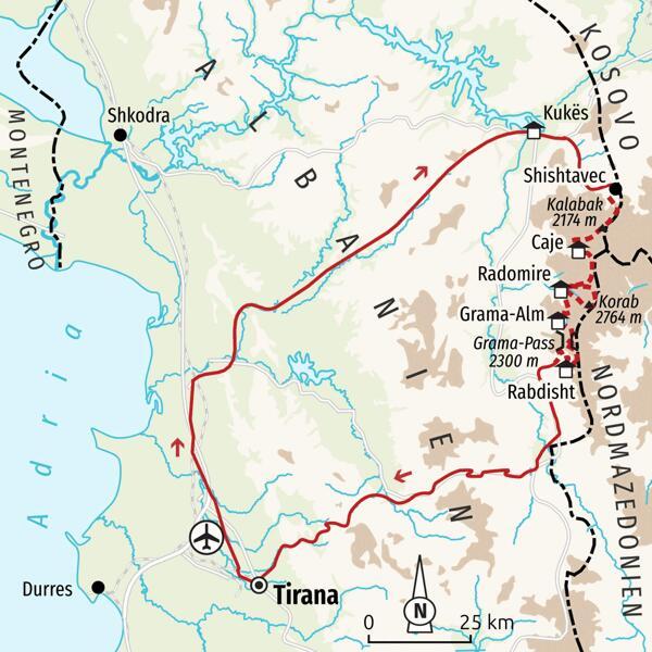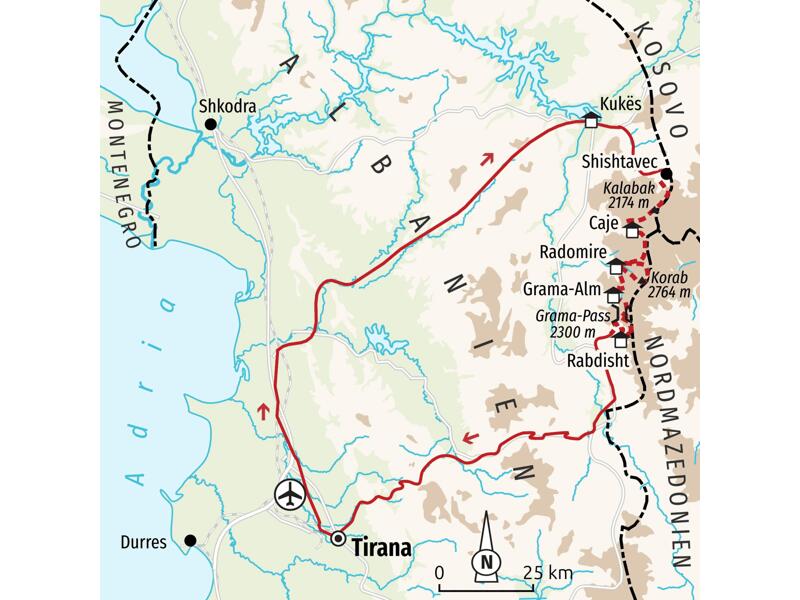 Flug nach Tirana und Transfer nach Kukes im Nordosten Albaniens unweit der Grenze zum Kosovo.