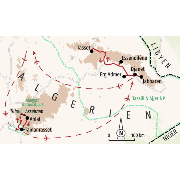 Voraussetzung für diese Reise sind Trittsicherheit, Kondition und Ausdauer für Wanderungen bis zu 7 Std. Gehzeit auf felsigem, gerölligem und sandigem Untergrund, teilweise in weglosem Gelände. Hitze erhöht die Anforderungen. Technische Vorkenntnisse sind nicht erforderlich. Die Besteigung des Tahat führt teils weglos, aber meist über festes und gut griffiges Blockgestein steil bergauf und kann ausgelassen werden. Gehzeiten können sich durch ungünstige Witterungsbedingungen und je nach Kondition der Gruppe verlängern. Die Wanderungen werden regelmäßig durch erholsame Pausen unterbrochen.
