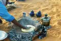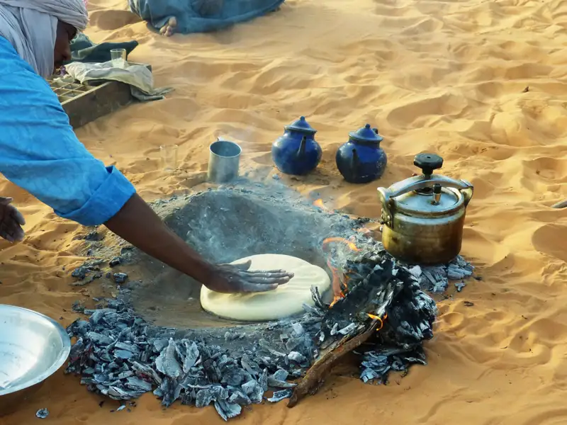 Bei dieser Reise ist Vollpension inkludiert. Der Koch bereitet mittags leichte Salate (mit Reis, Hülsenfrüchten, Tomaten, Gurken, o. ä.) zu, dazu wird Käse oder Thunfisch gereicht. Abends gibt es ein warmes Essen mit Suppe sowie Couscous, Kartoffeln, Reis oder Nudeln. Fleisch wird eher selten zubereitet, Gemüse ist fast immer enthalten. Unsere Tuareg-Köche geben sich große Mühe und zaubern unter einfachsten Umständen vielfältige Gerichte. Das Frühstück ist aus logistischen Gründen einfach gehalten. Es gibt Tee und Kaffee sowie Brot mit z. B. Margarine und Marmelade. Sollten Sie auf ein kräftiges Frühstück Wert legen, können Sie eingeschweißte Wurst, Käse oder Schwarzbrot (z. B. Pumpernickel) mitnehmen. Das Trinkwasser während der Reise wird Brunnen entnommen und wird von der Mannschaft in großen Kanistern mitgeführt. Das Wasser hat in der Regel hervorragende Qualität, sodass die Mitnahme von Micropur nicht zwingend erforderlich ist. Allerdings kann von Hauser Exkursionen für die Trinkwasserqualität keine Haftung übernommen werden. Bitte gehen Sie mit den Wasservorräten sorgfältig und sparsam um. Es ist in erster Linie zum Trinken vorgesehen, nicht zum Waschen. Es gibt kein Messezelt für die Mahlzeiten. Als Windschutz werden Flechtmatten aufgestellt, die den Speiseplatz umgeben. Während des Essens sitzt man auf den Liegematten und in der Mitte wird eine Kunststoffdecke ausgelegt, auf der das Essen serviert wird. Bitte achten Sie darauf, die Füße davon fernzuhalten. Zum Schlafen erhalten Sie für die gesamte Reise einen persönlichen Stoffüberzug für die Liegematte.