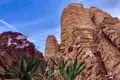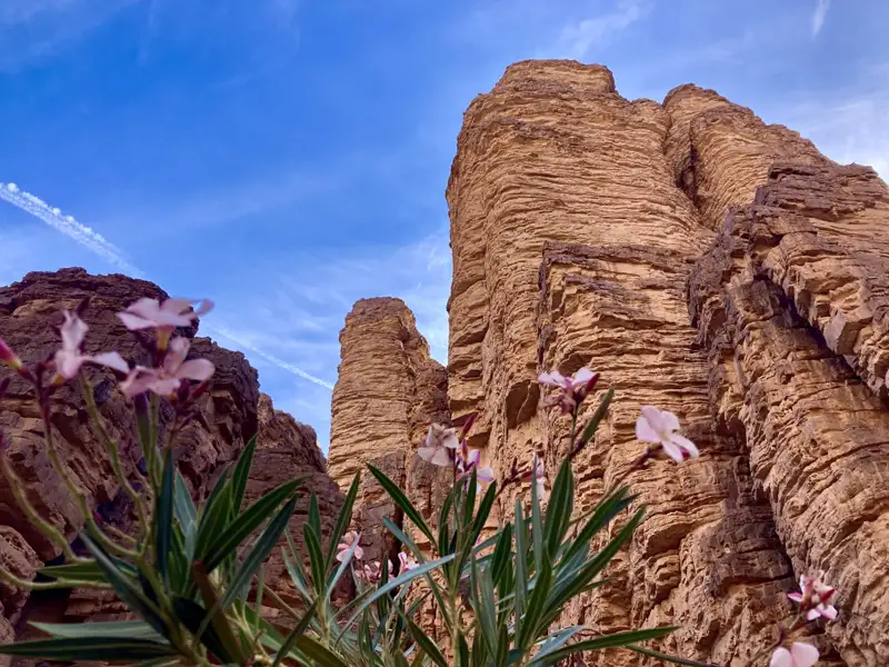 Wir durchqueren die kommenden Tage das Vulkanfeld Atakor, Herzstück des Nationalparks und der wilden Berglandschaft. Fels ist hier nicht gleich Fels. Manche sprechen von einem "geologischen Chaos", was aufgrund der landschaftlichen Vielfalt in dem Fall durchaus positiv gemeint ist. Wir wandern zwischen gigantischen Felsformationen und vereinzelten wilden Olivenbäumen vorbei. Gazellen und Mufflons sind scheu, aber mit Glück entdecken wir sie an den Berghängen. Dafür begegnen uns unterwegs bestimmt ein paar Wildesel oder Klippschliefer. In Tamsnejhak, auf ca 2100 m Höhe schlagen wir unseren Lagerplatz auf. Unweit dessen entdecken wir eine versteckte Schlucht, in der sich Wasserbecken, sogenannte Gueltas befinden – kleine Wunderwerke in der Sahara. Oft sind solche Wasserstellen im Schatten der Felswände jahrelang mit Wasser gefüllt, umgeben von rosa blühenden Oleanderbüschen.