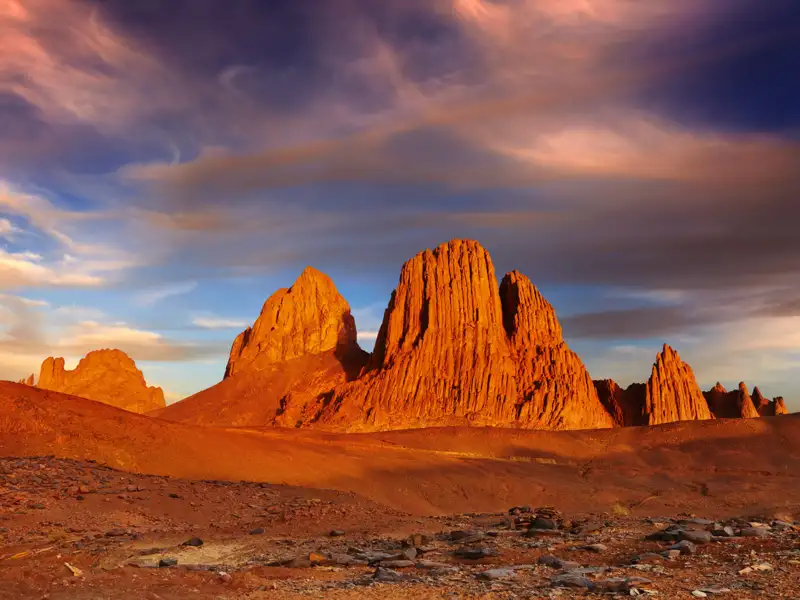 Das Hoggar ist eine der beiden auf jeder Afrika-Karte deutlich herausragenden Gebirgsmassive mitten in der Sahara. Sieben Tage lang trekken wir durch Regionen, die nur zu Fuß erreicht werden können: Vorbei an gigantischen rosafarbenen Granitkugeln, durch Wadis voller Oleander und mit Wasser gefüllten Felsbecken. Begleitet von den Tuareg und ihren Kamelen nähern wir uns dem für sie heiligen Berg Ilamane. Als besonderer Höhepunkt besteht die Möglichkeit, den Dreitausender Tahat und damit den höchsten Berg Algeriens zu erklimmen. Auf dem Assekrem Hochplateau besuchen wir die ehemalige Klause des Forschers Charles de Foucauld, der hier Anfang des 20. Jahrhunderts als Eremit lebte. Zum Assekrem schrieb er: "Die Aussicht übertrifft in ihrer Schönheit alle Worte und Vorstellungen. Nichts vermag den Zauber dieses Waldes von Felsspitzen und -nadeln, den man zu seinen Füßen hat, zu beschreiben." Wenn wir beim vielleicht schönsten Sonnenuntergang der Sahara ein Meer erloschener Vulkane und Basaltdome in pastellfarbenes Licht getaucht sehen, kommen wir sicherlich zum selben Schluss. Der zweite Teil der Reise führt uns in den Nationalpark Tassili n´Ajjer, wo weitere Facetten der Sahara auf uns warten: Tiefe Schluchten, Zypressen sowie ein Spiel aus Sandsteinformationen und einem endlosen Dünenmeer. Vom einst regen Leben und der damaligen Kunstfertigkeit zeugen prähistorische Felsbilder. Ein unermesslicher kultureller Wert im Zusammenspiel mit der landschaftlichen Vielfalt machen Algerien zu einem Reiseziel, dass uns im Handumdrehen zu Wüsten-Liebhabern macht.