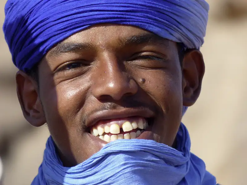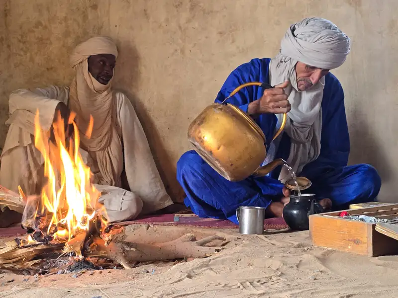 Auf dieser Reise sind wir mit einer einheimischen Tuareg-Begleitmannschaft unterwegs. Die Mannschaft arbeitet bereits seit vielen Jahren für unseren Partner vor Ort und war auf unzähligen Reisen mit Hauser Exkursionen unterwegs. Durch diese Reise leisten wir einen wichtigen Beitrag zum Einkommen der Begleiter und deren Familien. Trinkwasser wird größtenteils in Tanks mitgenommen oder es wird auf Brunnenwasser zurückgegriffen, Plastikflaschen werden vermieden.