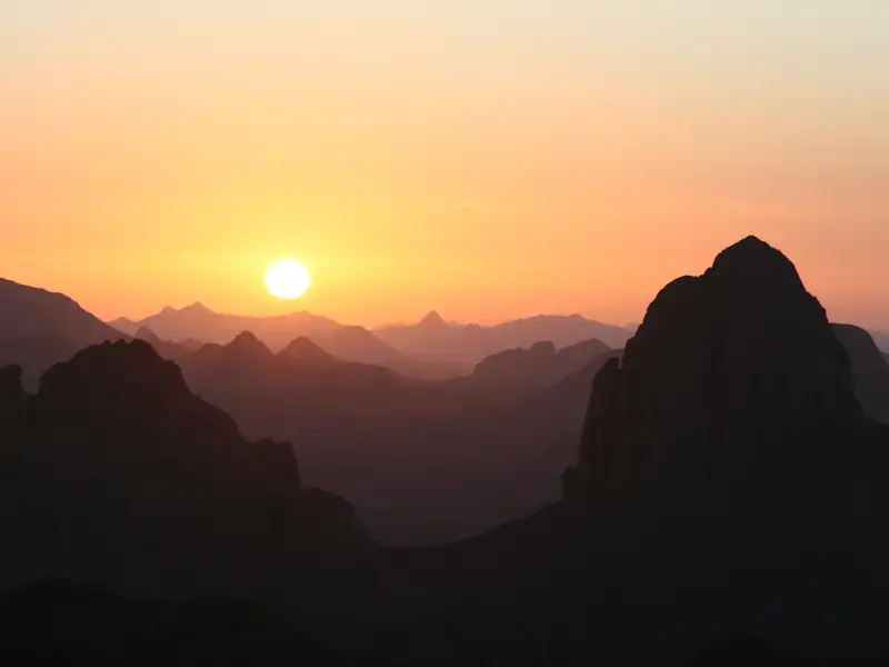 Wer heute den Tahat (3003 m) besteigen möchte, muss früh aufstehen. Wir wandern auf einem landschaftlich abwechslungsreichen Weg, immer mit Blick auf den majestätischen Felsendom Ilamane (2760 m), der aus lauter Orgelpfeifen zu bestehen scheint und für die Tuareg heilig ist. Unser Ziel ist jedoch der höchste Berg Algeriens, zugleich der zweithöchste Gipfel der Sahara. Nach etwa 2,5 Stunden Gehzeit beginnt der eigentliche, etwas mühsame Aufstieg auf den Tahat. Teils weglos, aber meist über festes und gut griffiges Blockgestein geht es steil bergauf. Je nach Lichtverhältnissen schimmert die Landschaft metallisch-farbig. Sobald wir nach weiteren 2 Stunden auf dem Doppelgipfel des Tahat ankommen, nehmen wir uns ausreichend Zeit, die unfassbar weite Aussicht auf die Wüste zu genießen. Vor uns breiten sich die erloschenen Vulkanhöcker, Basalt-Dome und Plateaus des Atakor von West nach Ost aus. Die gesamte Strecke unseres Trekkings liegt zu unseren Füßen. Nach rund 2 Stunden Abstieg erreichen wir unser Camp am Fuße des Tahat.