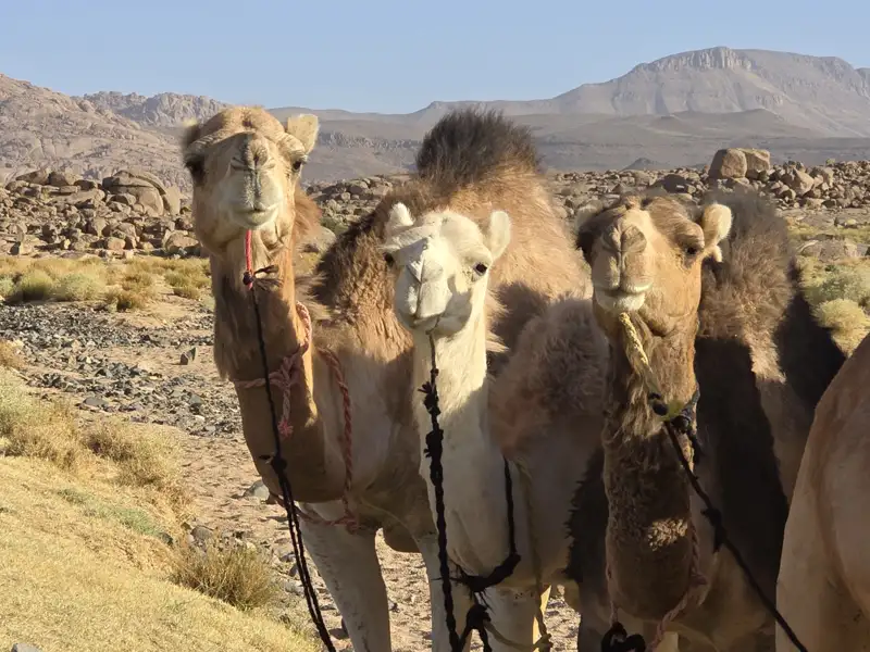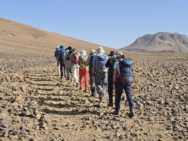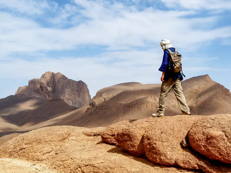 Nun sehen wir die besondere Architektur der Ecolodge zum ersten Mal bei Tageslicht – die Kuppeldächer und Innenhöfe mit Oleander sind typisch für die Sahara. Es handelt sich in Tamanrasset um die einzige Unterkunft in originaler Lehmbauweise. Nach dem Frühstück fahren wir entlang der Ostseite des Hoggar-Gebirges zum Treffpunkt mit unserer Tuareg-Mannschaft. Sobald die Kamele bepackt sind, beginnt unsere Durchquerung des Hoggar und zum höchsten Gipfel Algeriens! Um uns an unserem ersten Tag an die Wüste und das Klima zu gewöhnen, wandern wir gemächlich durch Täler mit Sandboden und Granit. Am Nachmittag unternehmen wir einen Aufstieg auf ein großes, weites Hochplateau, dessen Name, Taessa N'Adjena, auf Tamaschek "Bauch des Himmels" bedeutet. Das Plateau wirkt wie eine bizarre Mondlandschaft, aus der einzelne isolierte Vulkanberge aufragen. Unser Lager errichten wir auf 1700 m Höhe unweit des markanten Zweitausenders Adrar Hadjerine.
