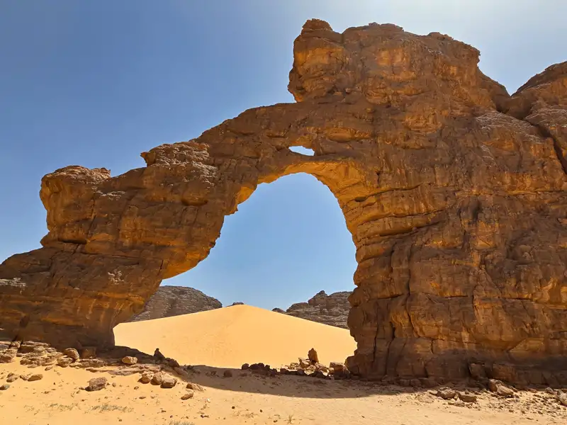 Vom Flughafen Djanet fahren wir erneut hinaus in die Wüste. Dort warten die aufgebauten Zelte bereits auf uns und wir nutzen die restlichen Stunden der Nacht zum Ausruhen. Nach dem Frühstück erfolgt eine Fahrt in die Tassili-Region nördlich von Djanet. Wir erreichen die Schlucht von Essendilène und wandern zu einem großen Wasserbecken tief im schattigen Felsen, umgeben von Oleanderbüschen und den darin hausenden Vögeln. Die Guelta leuchtet je nach Lichteinfall flaschengrün. Zeit für eine Mittagspause, bevor wir in die Dünen des Erg Essendilène starten. Dort errichten wir unser Nachtlager inmitten der Dünen und können den Sonnenuntergang mit Blick auf das Plateau des Tassili n´Ajjer genießen.