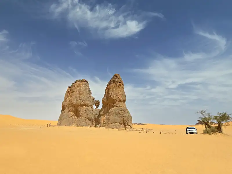 Nach einer kleinen Morgenrunde zu Fuß durch die Dünen holen uns die Fahrer ein und wir fahren hinauf auf das Tassili n´Ajjer-Plateau und weiter nach Tasset. Am Nachmittag unternehmen wir eine Wanderung durch die Felstürme und Sandstein-Formationen, für die die Gegend bekannt ist und in denen sich Felsmalereien verbergen. Vielleicht sind – je nach Situation der Futterplätze für Tiere - einzelne Nomadenlager zu sehen.