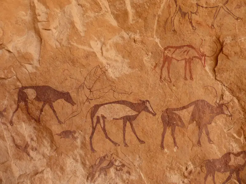 Wir gelangen nach dem Frühstück zu einem Tal mit einem Abri, an dessen Wänden wir außergewöhnlich feine Felsmalereien bewundern können. Die Fahrt danach vom Plateau hinunter, führt uns zu unserem Tagesziel, dem Ozean aus Sand im unendlich scheinenden Erg Admer. Die Nachmittagsstimmung bis zum Sonnenuntergang ist der schönste Moment um die Dünen zu erleben.