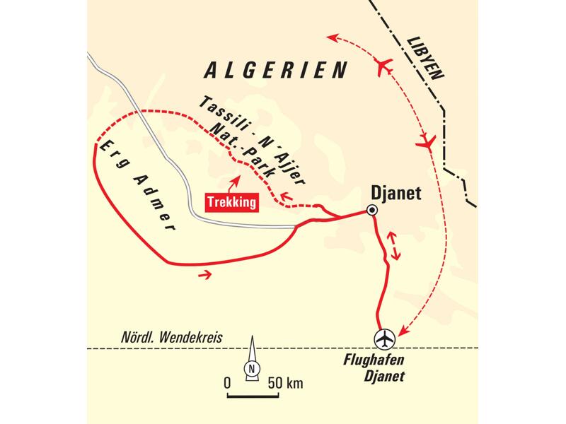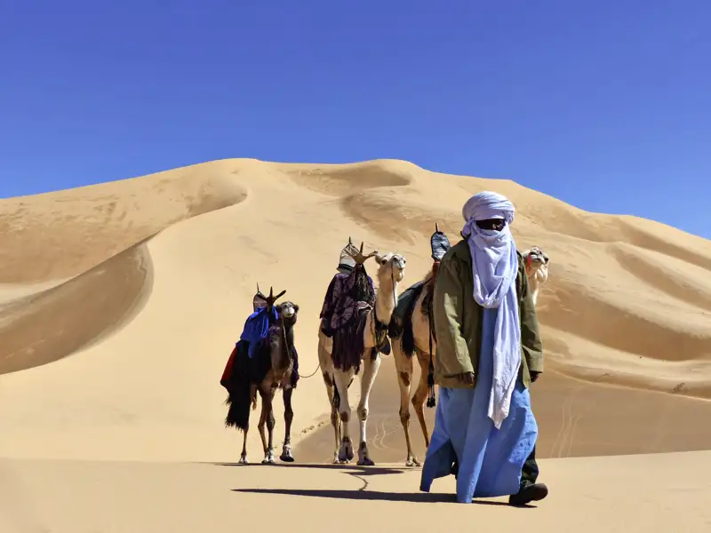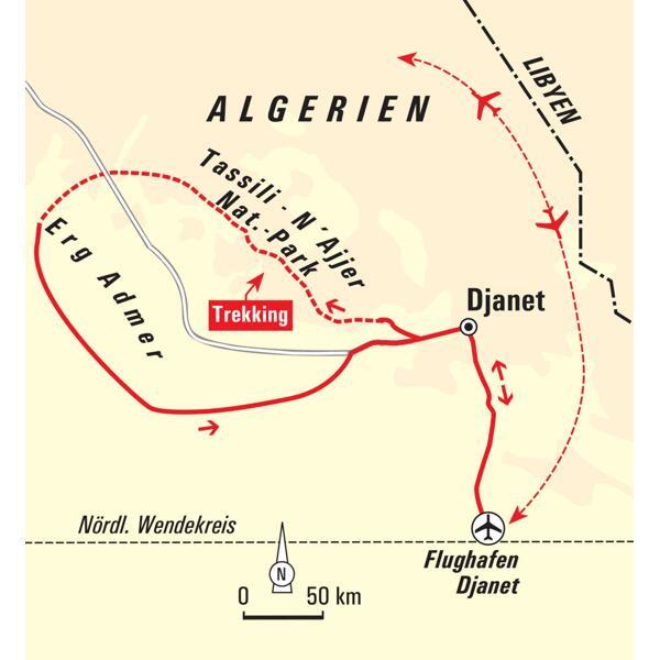 Der Fokus dieser Reise liegt auf dem Erleben der vielfältigen Wüstenlandschaft der Zentralsahara im Süden Algeriens. Die Fahrzeiten wurden auf ein absolutes Minimum beschränkt. Ein abwechslungsreiches Trekking führt durch die Ausläufer des Tasilli n'Ajjer Plateaus. Im Anschluss geht es mit Fahrzeugen tief hinein in die weiten Dünen des Erg Admer. Im Mittelpunkt der Reise steht das Erlebnis des entschleunigten Unterwegsseins – zu Fuß oder mit Kamelen in Begleitung einer erfahrenen Hauser-Reiseleitung und der Tuareg-Begleitmannschaft.