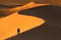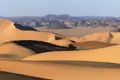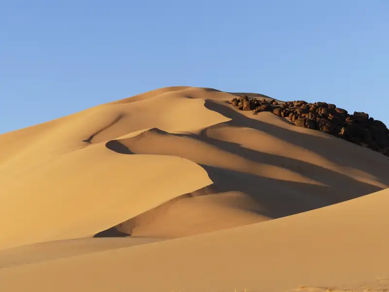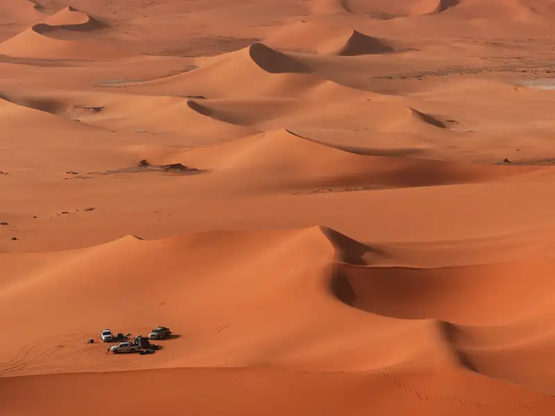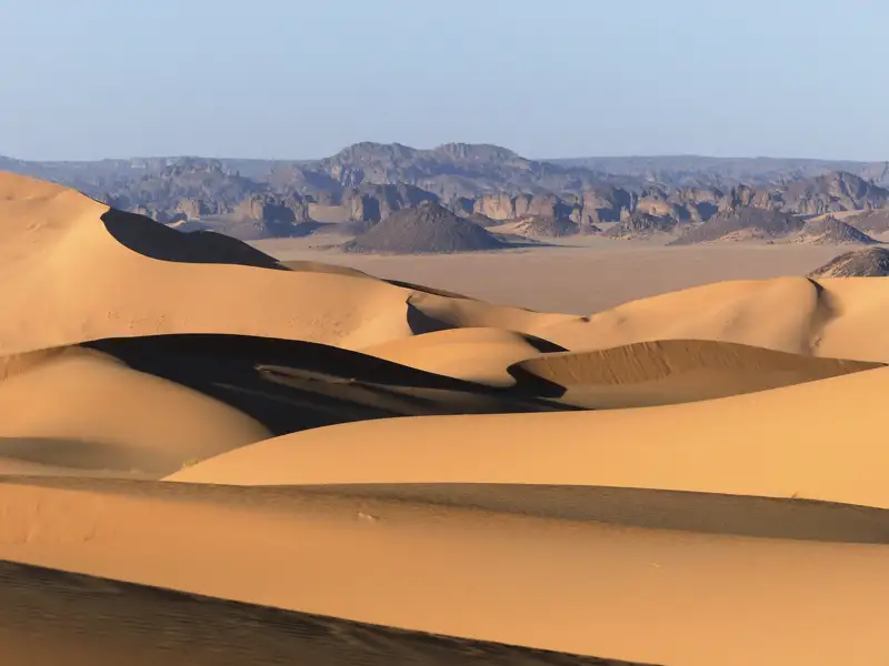 Der heutige Tag steht voll und ganz im Zeichen der Sandwüste. Wir wandern nach dem Frühstück in den nächsten Dünenkessel, so gelangen wir in einer Runde mit den Fahrzeugen zum Mittagsplatz zurück. Nachmittags erkunden wir mit den Fahrzeugen weiter entfernte Dünengebiete. Wir sehen nicht nur unendlich viele Ketten von Sanddünen, sondern können von hohen Dünen in der Ferne das Plateau des Tassili n'Ajjer sehen. Das Grande Finale des Tages liefert der Sonnenuntergang, wenn die sanft geschwungenen Dünen ins warme Abendlicht getaucht werden. Nach dem Sonnenuntergang kehren wir zu unserem Camp zurück, wo zum Einbruch der Dunkelheit das Abendessen serviert wird. Hier ist der ideale Platz, um uns einen Schlafplatz inmitten der Dünen zu suchen und zum Einschlafen den Sternenhimmel zu beobachten.