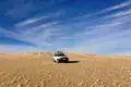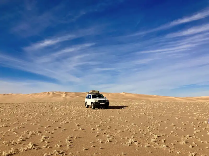 Nach dem Frühstück fahren wir zuerst auf der Seite des Tassili n'Ajjer durch vielfältige Wüstenlandschaft zum großen Felsbogen Tikobaouine. Am Nachmittag überqueren wir die Ebene nach Westen und tauchen in die Sandwüste namens Erg Admer mit ihren weiten Dünenketten ein.