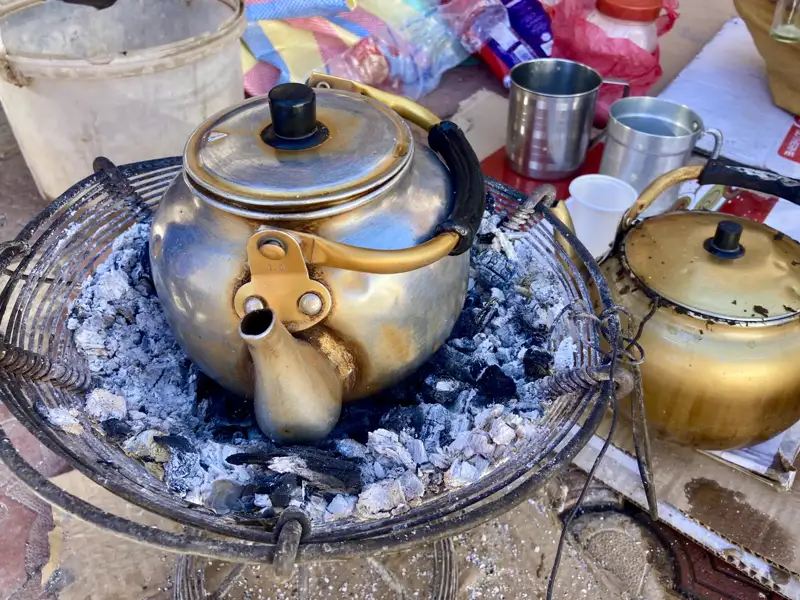 Bei dieser Reise ist Vollpension inkludiert. Während der Mahlzeiten sitzt man auf Schaumstoffmatten auf dem Boden. Wer Probleme hat, länger auf dem Boden zu sitzen, bekommt einen kleinen Hocker. Zum Frühstück gibt es Tee und Kaffee, Weißbrot sowie Margarine, Marmelade, Honig oder Schmelzkäse. Sollten Sie auf ein kräftiges Frühstück Wert legen, nehmen Sie gerne eingeschweißtes Brot (z. B. Pumpernickel) oder Knäckebrot mit. Mittags serviert der Koch schmackhafte Salate sowie Nudeln, Reis oder Hülsenfrüchte, dazu wird Thunfisch oder Käse gereicht. Am Nachmittag gibt es Kekse oder Nüsse zum Tee. Abends erwartet uns ein warmes Essen mit Suppe sowie einem Eintopf oder einem Gericht mit Kartoffeln, Reis oder Nudeln und Gemüse. Fleisch wird eher selten zubereitet. Das Trinkwasser während der Reise wird Brunnen entnommen und wird von der Mannschaft in großen Kanistern mitgeführt. Das Wasser hat in der Regel hervorragende Qualität, so dass die Mitnahme von Micropur nicht erforderlich ist. Hauser Exkursionen übernimmt jedoch keine Haftung für die Trinkwasserqualität.