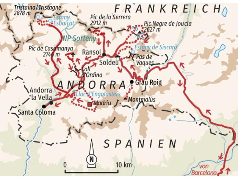 Wir fahren in den Nordwesten Andorras - fast bis zum Talschluss der Gemeinde von Ordino. Die Rundtour beginnt mit einem konstanten, aber kraftraubenden Anstieg zum ersten Karsee. Ein seichter Zwischenabstieg bringt uns zum Einstieg in das Seitental von Tristaina, wo uns drei weitere große Seen erwarten. Wir umrunden das kesselartige Tal und genießen dabei die herrlichen Ausblicke. Dieser Abschnitt erfordert jedoch viel Konzentration am steilen Hang. Ein letzter, kurzer, aber steiler Anstieg bringt uns schließlich auf die Kammhöhe, wo uns die Zivilisation erwartet: Eine gigantische Sonnenuhr und die Seilbahn, die uns einen großen Teil des Abstiegs erleichtert und uns zur Talstation des Skigebietes Ordino-Alcalis bringt. Das letzte Stück gehen wir wieder zu Fuß. Auf der Rückfahrt erkunden wir noch das lebendige Städtchen Ordino.