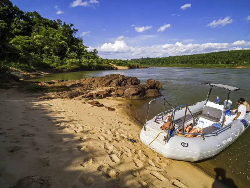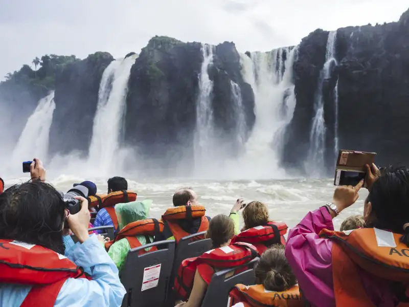 Sie unternehmen einen Tagesausflug zur argentinischen Seite der Wasserfälle mit deutsch sprechender Reiseleitung in einer internationalen Gruppe. Per Sammelbus geht es zuerst in den Nationalpark. Dort haben Sie Zeit, alle ausgewiesenen Touren auf den verschiedenen Stegen abzulaufen. Es gibt auch einen kleinen Zug, der Sie vom Visitor Center zum Aussichtspunkt am "Teufelsrachen" bringt. Auf dem Programm steht auch der als "Gran Aventura" bekannte Ausflug. Dabei geht es mit dem Geländewagen zunächst 8 km durch den Urwald bis zur Urwaldbasis "Puerto Macuco", wo die Boote bestiegen werden. Es folgen 6 km auf dem Rio Iguazú Inferior, davon weisen 2 km leichte Stromschnellen auf. Als Krönung gilt die Einfahrt in den "Teufelsrachen" (auf Spanisch "Garganta del Diablo"). Das Boot steuert in unmittelbare Nähe der Wasserfälle und spätestens jetzt bleibt niemand mehr trocken! Schwimmwesten und wasserdichte Behälter für Fotoapparate und andere schützenswerte Utensilien werden gestellt. Spätestens, wenn Sie gegenüber der Isla San Martín aussteigen, wissen Sie, warum das Programm "Gran Aventura" (auf Deutsch "großes Abenteuer") heißt. Rückkehr zum Hotel.