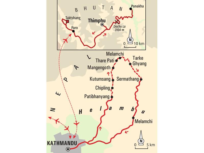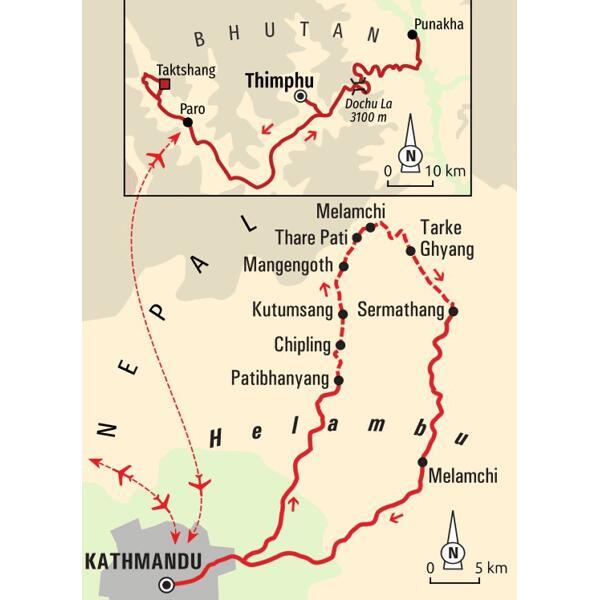 Der Fokus dieser Reise liegt auf einem Einsteiger-Trekking durch Bergdörfer Nepals mit Einblicken in die landschaftliche und kulturelle Vielfalt der Helambu-Region. Kombiniert wird das Trekking mit einem 5-tägigen Besuch im "Land des Donnerdrachen". Im kleinen Königreich Bhutan lernen wir die lebendige, spirituelle Kultur kennen - unter anderem durch den Besuch einen farbenprächtigen Klosterfestes.