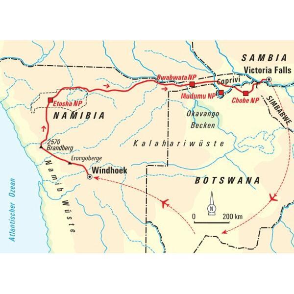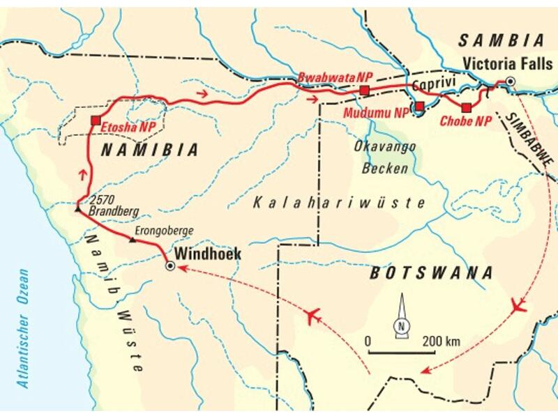 Sanft gleiten unsere Hände durchs seichte Wasser, in dem weiße Seerosen schwimmen. Die Sonne steht hoch, es ist fast still um uns. Wir sitzen bequem im Kanu, dem Ersatz für die traditionellen Einbaum-Boote (Mokkoro) und durchstreifen den sogenannten "Panhandle" des üppig bewachsenen Okavango Deltas. Der Wind streicht sacht durch das hohe Schilf. In der Ferne hören wir das Grunzen der Flusspferde und das Schnauben der Elefanten. Safari pur erleben wir während dieser Reise zwischen Wasser und Wüste noch häufiger: Löwen, Leoparden, Giraffen, Zebras und verschiedenste Antilopen begegnen uns im Etosha-Nationalpark. Hautnah erleben wir die afrikanische Tierwelt im offenen Geländewagen im Mudumu-Nationalpark und gehen im Chobe-Nationalpark auf Bootsafari. Vom Fluss aus nähern wir uns Krokodilen, badenden Elefanten und Wasservögeln. Das ist Afrika, wie wir es uns erträumt haben. Im Erongo Gebirge wandern wir am Hohenstein und bestaunen die verwitterten riesigen Granitkugeln und Bögen der Spitzkoppe, dem "Matterhorn Namibias". Die Wüstenberge bieten immer wieder ein faszinierendes Farbenspiel. Auf einer kleinen Wanderung lernen wir die "White Lady" im Brandberg-Massiv kennen. Wie das Spurenlesen, Feuermachen und Jagen hier abläuft, erfahren wir vom Volksstamm der Xwe im Caprivi. Mit Respekt beobachten wir die tosenden Wassermassen der Victoriafälle, die sanft Regenbögen in den Himmel zeichnen. Eine Fülle an Naturerlebnissen zwischen den orange-rot im Sonnenuntergang schimmernden Wüstenbergen und dem tiefen Blau des Chobe, Kwando und Sambesis erwarten uns!