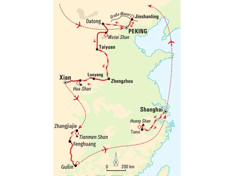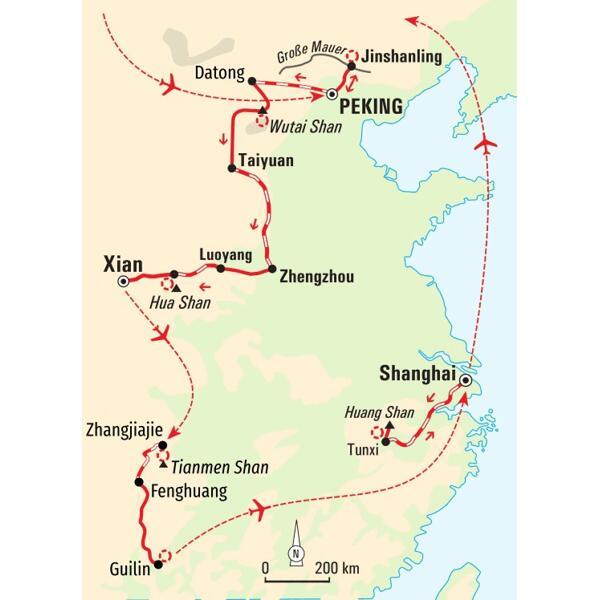 Wie dicke Nadeln ragen die Berge in den Himmel. Nebelschwaden wabern geheimnisvoll zwischen den Felsen bis das Sonnenlicht die Bühne betritt und die Wolkendecke in die Nebenrolle drängt. Das Huang Shan-Gebirge mit seiner dramatischen Kulisse ist filmreif – kein Wunder, dass es für viele Künstler als Inbegriff der Inspiration für Gemälde, Gedichte und Geschichten gilt. Aber auch die anderen "Heiligen Bergwelten" gehören eindeutig ins Rampenlicht: Wir wandern auf der sanften Hochebene des Wutai Shan und bewundern die bilderbuchartigen buddhistischen Tempel entlang des Weges. Am, von den Daoisten verehrten, Songshan öffnet das weltberühmte Shaolin-Kloster seine Tore für uns und das Huang Shan-Gebirge setzt seine steilen Felswände mit den knorrigen Kiefern perfekt in Szene. Der Hua Shan liefert uns mit seinen bizarren Klippen und theatralischen Felsabstürzen atemberaubende Motive, aber natürlich widmen wir uns auch den kulturellen Schauplätzen des Reiches: In der Megacity Peking staunen wir über die prachtvolle Verbotene Stadt und in der Boomtown Shanghai über die futuristische Skyline. Wir halten beim Anblick der stolzen Terrakotta-Krieger den Atem an und atmen den Duft der Räucherkerzen beim Besuch des hängenden Klosters. Wir werden ganz klein bei unserer Wanderung durch die imposanten Halleluyah-Berge und auf der Großen Mauer und bekommen großen Appetit in den einladenden Garküchen. Ausgerechnet Konfuzius prägte die Lebensweisheit "nichts hören, nichts sehen, nichts sagen", dabei erwartet uns in China genau das Gegenteil: Wir hören spannende Geschichten, sehen unvergleichliche Naturlandschaften und sagen am Ende "Fortsetzung folgt".