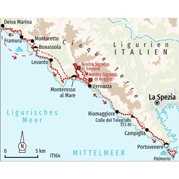 "Fünf Ortschaften" – der schlichte italienische Name dieser Region wird ihrer prächtigen Schönheit kaum gerecht. An diesem malerischen Küstenstreifen wechseln sich bizarre Klippen, farbenfrohe Orte, idyllische Buchten und winzige Häfen ab und zaubern ein unverkennbares Panorama.Sie erkunden die berühmten Dörfer auf eigene Faust – ganz nach Ihrem eigenen Rhythmus. Herzstück Ihrer Touren ist das Roadbook, das Ihnen neben detaillierten Wanderbeschreibungen auch Restaurant- und Besichtigungstipps liefert. So bleibt Ihnen genug Zeit, um nach den erlebnisreichen Wanderungen die Strände der Ligurischen Riviera zu entdecken oder das bunte Treiben in den Küstenorten zu genießen.