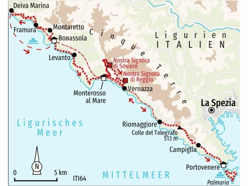 Mit dem Zug erreichen Sie Riomaggiore. Zunächst führt der Weg durch die steilen Gassen des Küstendorfs, dann vorbei an terrassierten Feldern bergauf zur Wallfahrtskirche Madonna di Montenero. Ein atemberaubender Ausblick über die gesamte Küstenregion ist der Lohn für den etwas mühevollen Aufstieg. Weiter geht es über den Bergkamm Colle del Telegrafo. Durch Weinterrassen und entlang der spektakulären Steilküste folgen Sie einem Wanderpfad nach Campiglia und weiter zum malerischen Küstenort Portovenere.