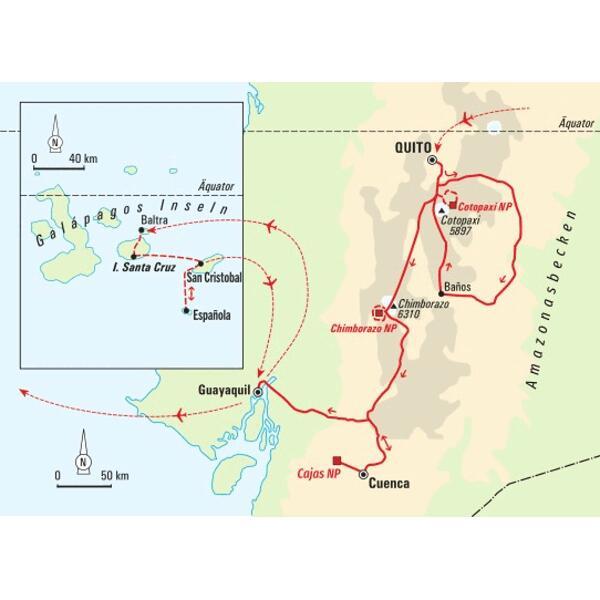 Der Fokus dieser Reise liegt auf den Naturregionen Ecuadors auf dem Festland und den Galápagos-Inseln. Auf verschiedenen Wanderungen erkunden wir das Andenhochland und Amazonasgebiet auf dem Festland Ecuadors sowie den Artenreichtum auf den Galápagos-Inseln. Dabei erhalten wir einen umfassenden Einblick in die vielfältige Natur des Landes. Naturliebhabende kommen beim Besuch von drei Nationalparks (Cotopaxi, Cajas, Chimborazo), einem Aufenthalt in einer Amazonas-Lodge sowie vier Übernachtungen auf den zwei Galápagos-Inseln San Cristóbal und Santa Cruz voll auf ihre Kosten.