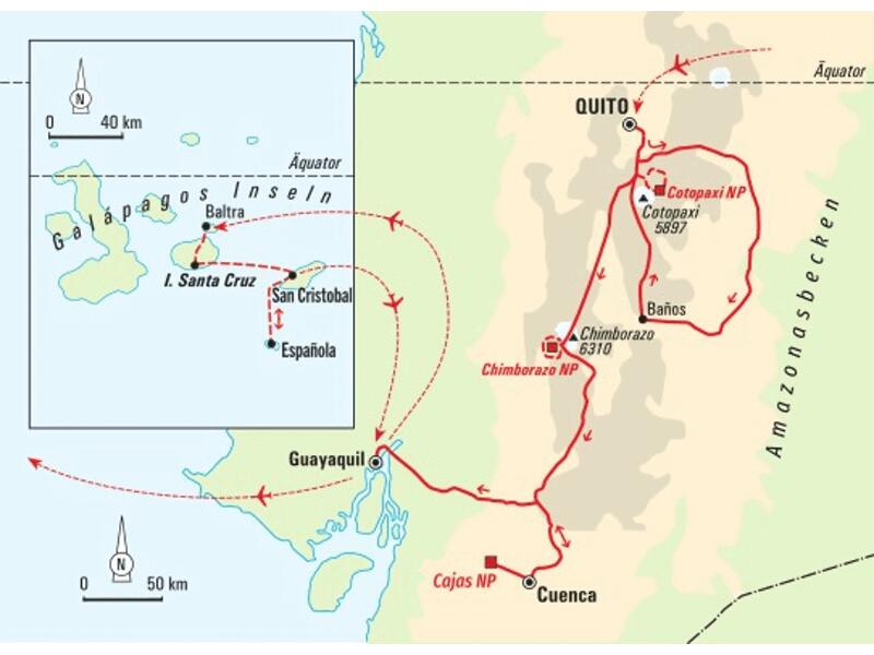 Die vergletscherte Vulkanspitze des Cotopaxi ist von Schäfchenwolken umgeben. Lamas weiden zu seinen Füßen. Die Straße der Vulkane erstreckt sich vor uns. Über abgeschiedene Bergdörfer erreichen wir die grün schimmernde Kraterlagune Quilotoa. Zuerst noch von Wolken umhüllt lüftet sich schon kurze Zeit später der Himmel und macht den Blick frei auf die andine Páramolandschaft. Wir verlassen die Anden und gelangen hinab ins Amazonas-Gebiet. Mit dem Kanu schippern wir entlang des schmalen und kurvenreichen Rio Arajuno durch den Regenwald und beobachten die Kapuzineräffchen, wie sie sich von Baum zu Baum hangeln. Wir stöbern über bunte Wochenmärkte, bestaunen die Webtechnik der indigenen Frauen und kosten an den Ständen Choclo, goldgelb gebackene Maiskolben. Nach den faszinierenden Erlebnissen im Andenhochland begeistert uns die endemische Tierwelt der Galápagos Inseln. Wir spazieren zwischen Riesenschildkröten und können diese hautnah in ihrem natürlichen Lebensraum beobachten. Wir erleben eine überwältigende Artenvielfalt auf kleinstem Raum.