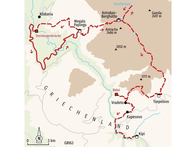 Nach einem einfachen, aber gemütlichen Frühstück packen Sie Ihren Rucksack und verlassen die Hütte. Ihr Weg verläuft über Almwiesen zwischen den Gipfeln Astraka und Gamila. Vielleicht begegnet Ihnen Gamswild, das hier oben heimisch ist. Schließlich geht es bergab in die Schlucht Megas Lagos, die in der Vikos-Schlucht endet. Ein letzter Abstieg führt Sie nach Tsepelovo, wo Ihr herzlicher Gastgeber mit Ihrem Gepäck auf Sie wartet. Der gemütliche Dorfplatz lädt Sie zu entspannenden Stunden ein.