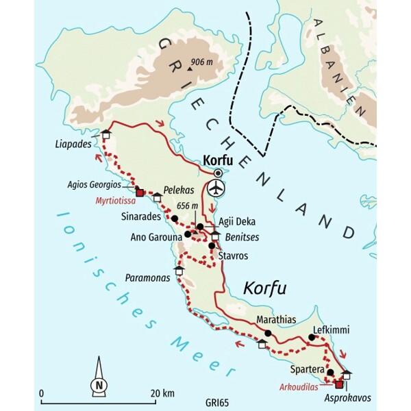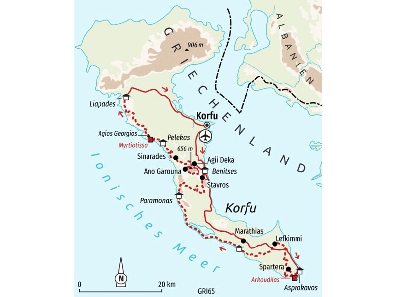 Der Fokus dieser Reise liegt auf einem ausgewählten Teilabschnitt des Korfu-Trails, der sich über knapp 200 km erstreckt und die Insel von Süd nach Nord durchzieht. Sie sind auf dem südlichen Teil des Trails unterwegs und folgen ihm in Richtung Norden. Dieser Verlauf bietet Ihnen den Vorteil, vom malerischen, flachen Süden Etappe für Etappe eine bergigere, kontrastreichere Landschaft zu entdecken.