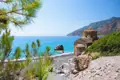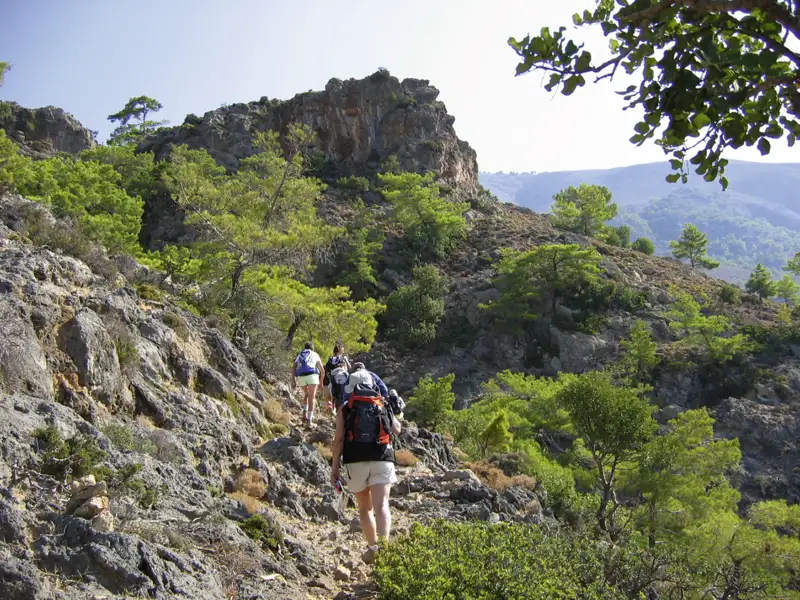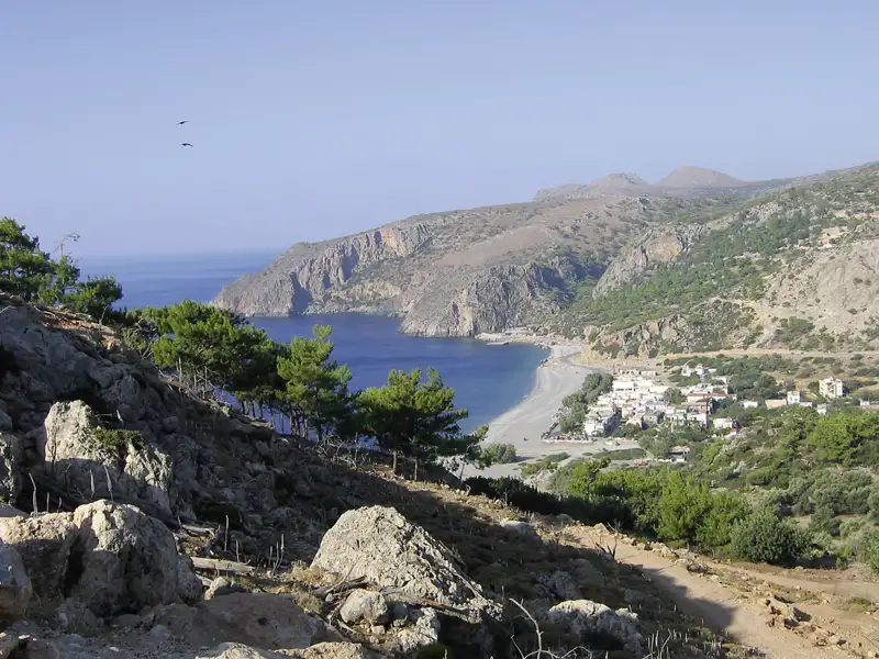 Einer der schönsten Abschnitte der Südküste und des E4 liegt vor uns. Auf steinigen und sandigen Pfaden, gelegentlich über Felsbrocken und im Schatten großer Kiefern wandern wir einen Hang entlang. Dann steigen wir hinab ans Meer zur Kapelle Agios Pavlos. Hier soll der Apostel Paulus an Land gegangen sein, um in einer der Quellen Neu-Bekehrte zu taufen. Wir besichtigen das Kirchlein aus dem 11. Jh., dann steigen wir durch Pinienwälder hinauf zum Selouda-Pass. Von oben haben wir einen herrlichen Blick über die Küste. Auf Hirtenpfaden geht es weiter ins Dorf Agios Ioannis, von wo wir nach Anopolis fahren, unserem Übernachtungsort.