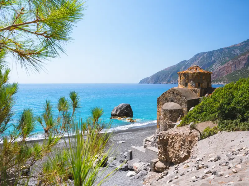 Nach den anstrengenden Wanderungen der letzten Tage, gehen wir es heute gemütlicher an. Von Agia Roumeli aus wandern wir zu einer alten türkischen Festung. Auf unserem Weg passieren wir einen kleinen Kiefernwald und genießen immer wieder schöne Aussichten auf das Libysche Meer. Auf einem anderen Weg steigen wir wieder ab nach Agia Roumeli. Der Nachmittag steht zur freien Verfügung. Abseits der Touristenströme lädt der kleine Ort zu einem entspannten Strandspaziergang ein.
