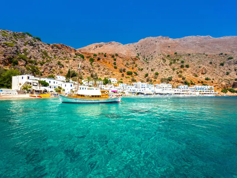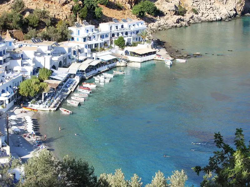 Nach einem Frühstück in den Bergen durchqueren wir Kretas zweitgrößte Schlucht, die tief eingeschnittene Aradena-Schlucht. Umgeben von rot und gelb schimmernden Felswänden führt unser Weg talauswärts bis ans Ende der Schlucht, die in die Marmara-Bucht mündet. Türkisfarbenes Wasser umspült die weißen Marmorbänke der beliebten Badebucht. Im gleichnamigen Dorf legen wir eine Mittags- und Badepause ein. Gestärkt folgen wir dann wieder dem Küstenpfad bis wir Loutro erreichen. Das kleine Fischerdorf liegt geschützt in einer ruhigen, schönen Bucht. Hier übernachten wir heute.