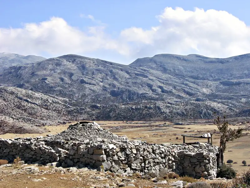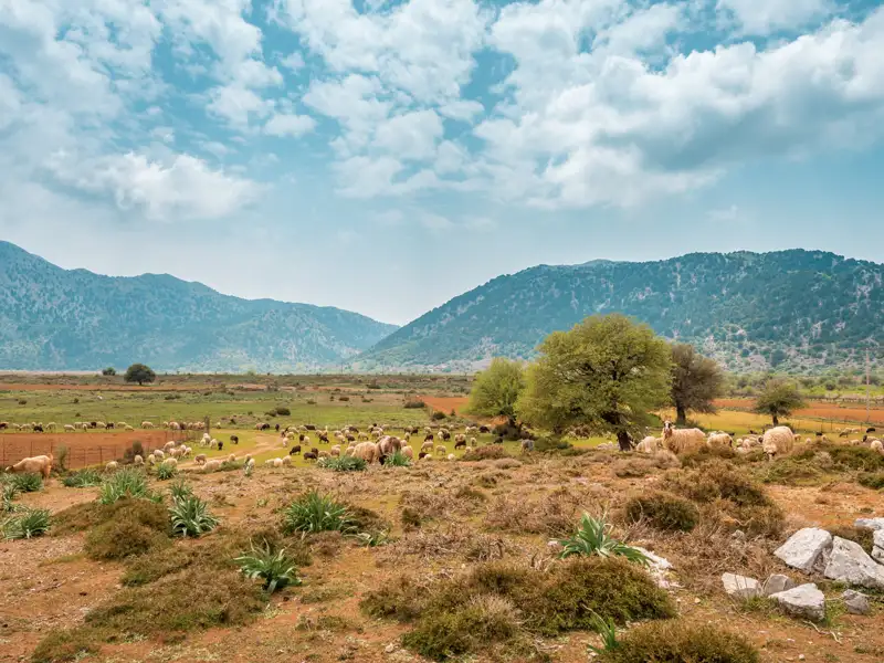 Eine Etappe auf Kretas Fernwanderweg E4 – von Paleochora zum Fischerdorf Sougia – steht heute auf dem Programm. Wir wandern zunächst am Meer entlang und passieren kleinere Buchten, dann geht es landeinwärts und wir überwinden einen kleinen Bergrücken. Ein schmaler Pfad führt uns hinunter zur Bucht des antiken Lissos. Wir besichtigen die historische Stätte, ein antikes Heilbad mit dem berühmten Tempel des Asklepios. Anschließend wandern wir über einige Terrassen bergan und durch eine kleine Schlucht bis zum Fischerhafen Sougia. Nach einer kurzen Erfrischung im Meer verabschieden wir uns für ein paar Tage von der Küste und wagen einen Abstecher in die Berg- und Schluchtenwelt der Lefka Ori (Weiße Berge). Ein öffentlicher Bus bringt uns hinauf nach Omalos (1.050 m). Dort beziehen wir unser Quartier für die nächsten Nächte.