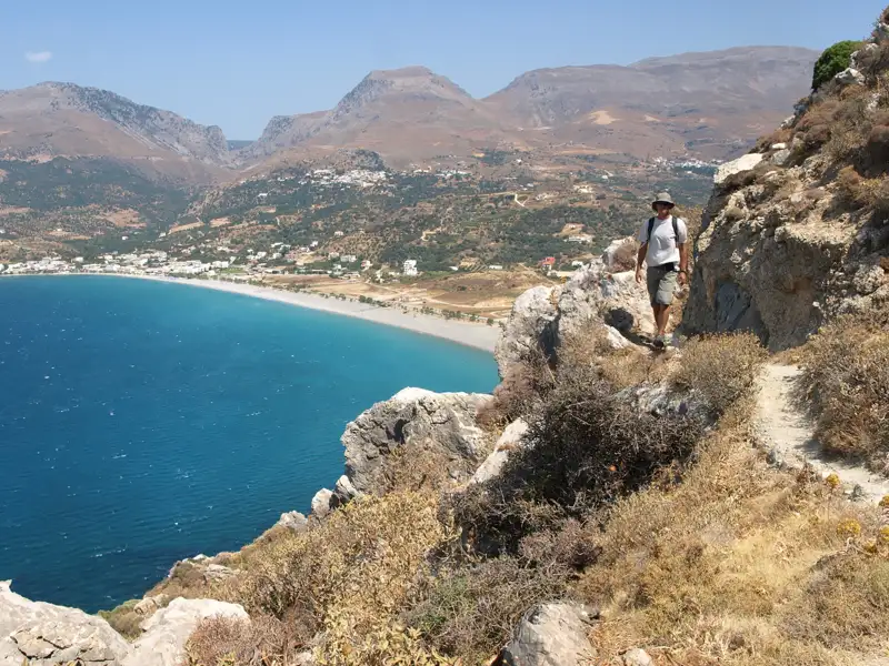 Eine Tageswanderung führt uns in die Umgebung von Paleochora. Entlang der Küste wandernd erreichen wir nach etwa einer Stunde die Anidri-Schlucht. Wir folgen dem Flussbett und treffen entlang des Wegs auf Ziegen, die wie Profis die Felswände erklimmen und nach schmackhaften Kräutern suchen. Am Ende der Schlucht steigen wir mit Blick auf das Libyische Meer zur Profitis-Ilias-Kapelle auf. Hier machen wir eine kleine Pause und genießen die Ruhe in der herrlichen Landschaft. Der Rückweg bereitet uns erneut einen wunderbaren Ausblick auf Paleochora und das tiefblaue Meer. An der Küste angekommen, haben wir noch genügend Zeit für einen Sprung ins Meer, bevor wir zurück nach Paleochora wandern.