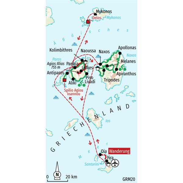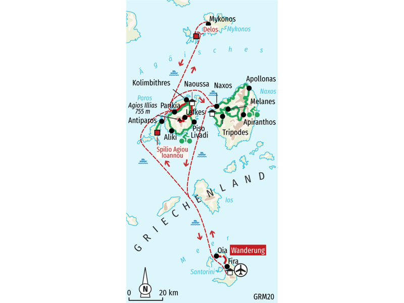 Die Kykladen sind der Inbegriff der griechischen Inselwelt. Vier der schönsten Inseln erkunden wir mit dem Trekkingbike, jede unverwechselbar und doch typisch für das, was die Kykladen so faszinierend macht: Weiß gekalkte verwinkelte Häuser, karge Gebirgszüge mit grünen und blühenden Tälern, tiefblaues Meer unter wolkenlosem Himmel, feinsandige Strände und viele Zeugnisse griechischer Kunst und Kultur. Beeindruckt von der Natur der traumhaften Ägäis genießen wir auch die gute mediterrane Küche mit ihren vielen frischen Zutaten und vor allem die herzliche griechische Gastfreundschaft der traditionsverbundenen Einwohner. Und wir erleben eine abwechslungsreiche Reise: Malerische Kulissen aus weißen Fischerdörfern, Klöstern und Kirchen auf Paros und Antiparos, herrliche Panoramastrecken auf der größten Kykladeninsel Naxos und eine wunderschöne Wanderung am Steilrand des Kraters auf Santorin. Zwischendurch laden schattige Olivenbäume uns zur Siesta ein und traumhafte Strände zu einem Bad im türkisblauen Meer. Von der griechischen Sonne verwöhnt, lassen wir abends bei einem Ouzo die Tage Revue passieren. Griechenland von seiner schönsten Seite, Meerblick inklusive!