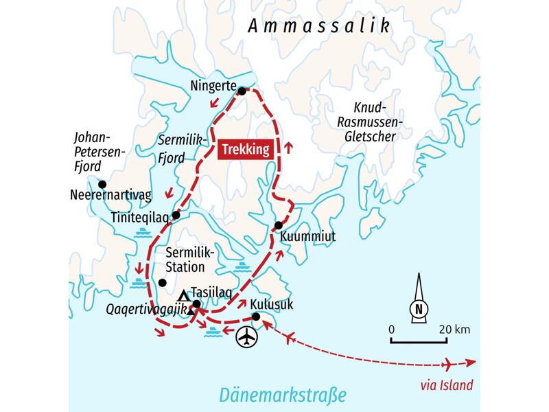 Voraussetzung für diese Reise sind, aufgrund der sich kurzfristig ändernden Eis- und Wetterverhältnisse, ein hohes Maß an Flexibilität, Abenteuerlust, Kondition und Ausdauer für Wanderungen mit bis zu 8 Std. Gehzeit in häufig weglosem Gelände. Da es in der Wildnis nur selten Pfade gibt, haben die Wanderungen einen gewissen Pioniercharakter, erfordern vor allem gute Trittsicherheit in unebenem Gelände und eine hohe Konzentration sowie Schwindelfreiheit für die Tour auf den Qaqertivagajik. Blockgelände, Geröll, Gletschermoränen, Felsplatten, Schotter, Altschneefelder und Bachdurchquerungen sind zu bewältigen, vergleichbar mit dem Alpenraum auf 2000 - 3500 m. Die einzelnen Tagesetappen weisen ansonsten keine besonderen Schwierigkeiten auf, aber aufgrund der physischen und psychischen Belastungen, die bei schlechtem Wetter auftreten können, sowie aufgrund der Anforderungen, vergleichbar mit einer Hochtour, wird diese Tour mit dem Schwierigkeitsgrad IV bewertet. Gehzeiten können sich durch ungünstige Witterungsbedingungen und je nach Kondition der Gruppe verlängern. Einzelne Tagesetappen können nicht ausgelassen werden. Wir tragen alles, was wir für die Zeit des Trekkings benötigen sowie den eigenen Anteil der Lebensmittelvorräte in unserem Tourenrucksack, d. h. zum persönlichen Gepäck kommen ca. 1,5 kg zusätzlich dazu. Die Zelte wiegen ca. 2 - 3 kg, bei Buchung eines Einzelzeltes muss dieses Gewicht alleine getragen werden.
