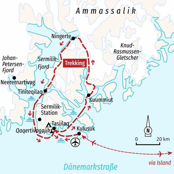 Wir empfehlen einen Trekkingrucksack für diese Reise, den Sie auch während des Trekkings bei sich haben. Ein Koffer ist nicht geeignet. Zusätzlich empfehlen wir eine abschließbare Reisetasche. So können Sie alles, was Sie während des Trekkings nicht benötigen, in Tasiilaq einlagern (auf eigene Haftung).