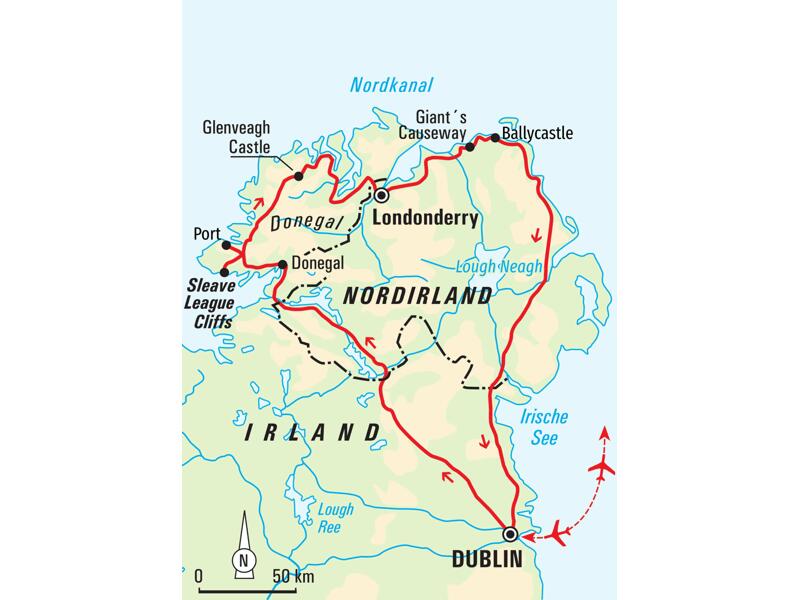 "Ich wandere los im Regen entlang der steilen Felsküste. Irgendwann gibt es keinen Weg mehr und ich folge den grasenden Schafen und den steilen Klippen. Plötzlich taucht eine sandige Bucht vor mir auf. In der prallen Sonne leuchtet sie in den sattesten Farben, die man sich vorstellen kann. Dahinter funkelt der stahlblaue Atlantik, der gerade noch unauffällig grau im Hintergrund meiner Wahrnehmung verschwand. Was die Natur hier mit meinen Gefühlen macht, ist einzigartig: Freiheit, Glück und Dankbarkeit erfüllen mich sowie eine tiefe Freude, dass es solche Momente gibt." (Manfred Häupl) Im Rhythmus des Meeres erkunden wir die wilde Küste im Norden Irlands. Wir wandern im Takt der wechselnden Lichtstimmungen auf den schönsten Etappen des Wild Atlantic Way, halten die Nase in den Wind und atmen dabei den Geruch von Salz und Torf. Wir blicken immer wieder in faszinierende Landschaften, die sich fast surreal in unser Gedächtnis graben. Riesige Basaltsäulen, gigantische Steilklippen und karibisch-weiße Sandstrände zaubern für uns ein Bild voller Kontraste. Dabei lauschen wir den Geschichten der "Grünen Insel", erfahren von Literaten und Freiheitskämpfern und hören von Hungersnöten und Wirtschaftswundern. Wie Efeu umranken die Legenden von Gnomen und Riesen das Land und sorgen für einen allgegenwärtigen Hauch von Mystik. Wir genießen typisch irische Mahlzeiten, besuchen historische Schlösser und spätestens bei einem Guinness im Pub fühlen wir die irische Seele.