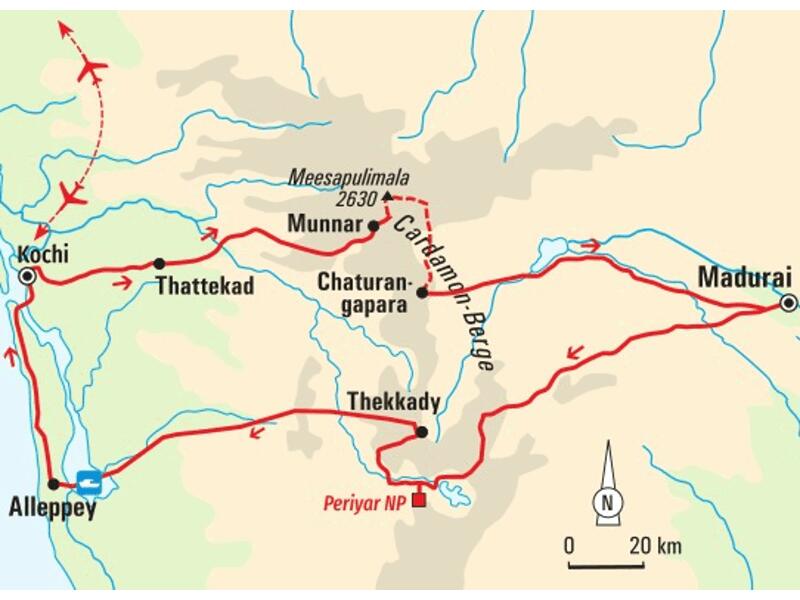 Überall wuchert saftiges Grün. Weitläufige Teeplantagen und exotische Gewürzgärten bedecken die Landschaft, Kokospalmen spenden Schatten. Tropische Wälder bedecken die Berghänge, ein dichtes Netz an Wasserstraßen zieht von den Hügeln bis zum Meer, unzählige Seen und Lagunen speisen die Felder. Schmetterlinge flattern an den Blüten, Vogelstimmen erfüllen die Luft - wir sind in Kerala, dem "Land der Kokosnüsse". Aber nicht nur die Kokosnüsse, sondern die gesamte Natur zwischen dem Gebirgszug der Westghats und dem Indischen Ozean zieht uns in ihren Bann. Wir wandern durch den Regenwald, über üppige Plantagen und gehen im Wildtierreservat Periyar auf die Pirsch. Wir trekken durch die Kardamom-Berge, durchqueren offenes Buschland und hügelige Graslandschaft und waten durch sprudelnde Gebirgsbäche. Vom Gipfel des Meesapulimala blicken wir auf die bewaldeten Hügel, vom Chaturanga Peak auf die Tiefebene von Tamil Nadu. Wir campen in einer Kardamom-Plantage, genießen den Sonnenaufgang über dem Schmetterlingswald und den Sternenhimmel am Anaerangal-See. Im Mathikettan-Nationalpark folgen wir den Spuren von Wildrindern, halten Ausschau nach Elefanten und lauschen dem Gebrüll der Affen. Und am Ende ruft das Wasser: Wir gehen an Bord eines Hausbootes und gleiten zwei Tage durch die Backwaters, wir übernachten in einem luxuriösen Resort am Vembanad-See und spazieren entlang der Kanäle von Dorf zu Dorf. Beim leisen Rauschen des Wassers am Seeufer denken wir noch einmal an die religiösen Gesänge der Pilger in Madurai, an das Treiben auf dem Basar von Munnar und natürlich an eindrucksvolle Zeit im geheimnisvollen Bergland.