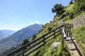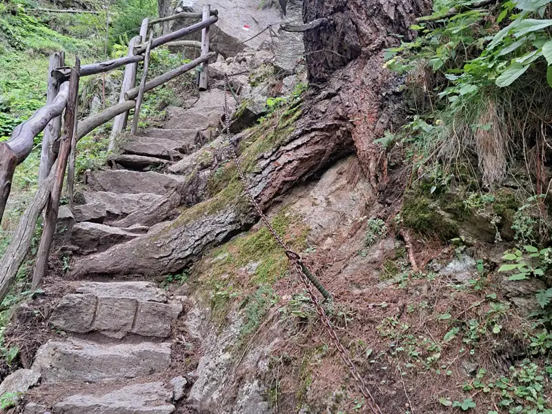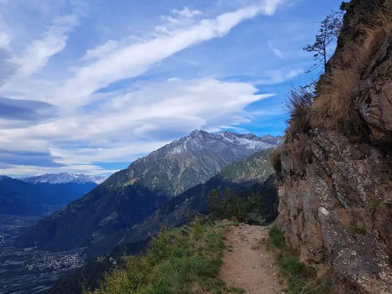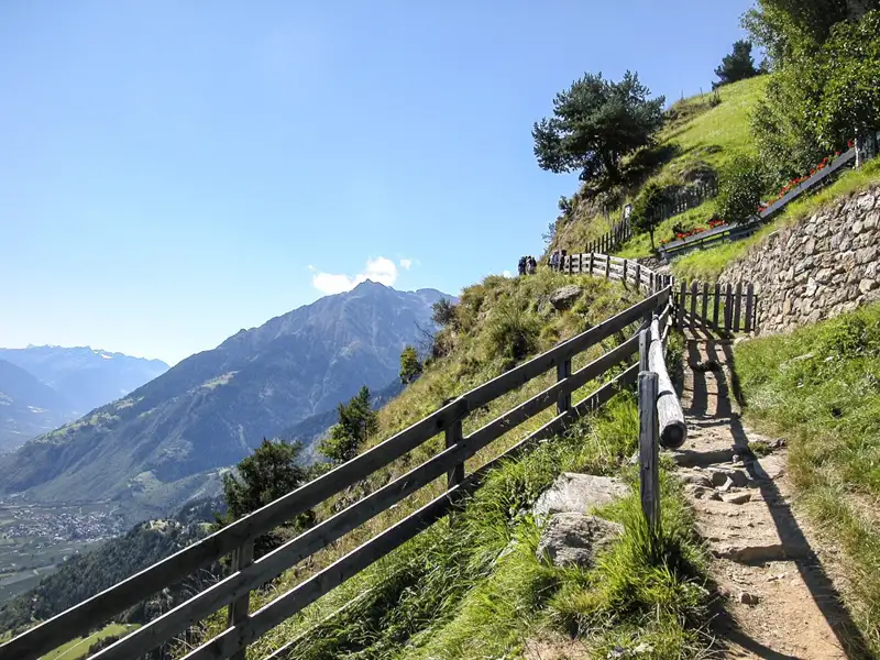 Der heutige Weg führt uns steil hinauf zum Gigglberg, mit atemberaubendem Blick auf die am Hang liegenden Bergbauernhöfe von Tabland. Große Granitplatten leiten uns hinab in die 1000-Stufenschlucht, wo uns eine luftige Hängebrücke über das Tal führt. Auf der anderen Seite geht es über Holzstufen bergauf zum Pirchhof, wo wir eine wohlverdiente Rast einlegen. Weiter führt uns der Meraner Höhenweg durch eine Landschaft von Bergbauernhöfen und alten Materialseilbahnen, die den Charme der Region unterstreichen.